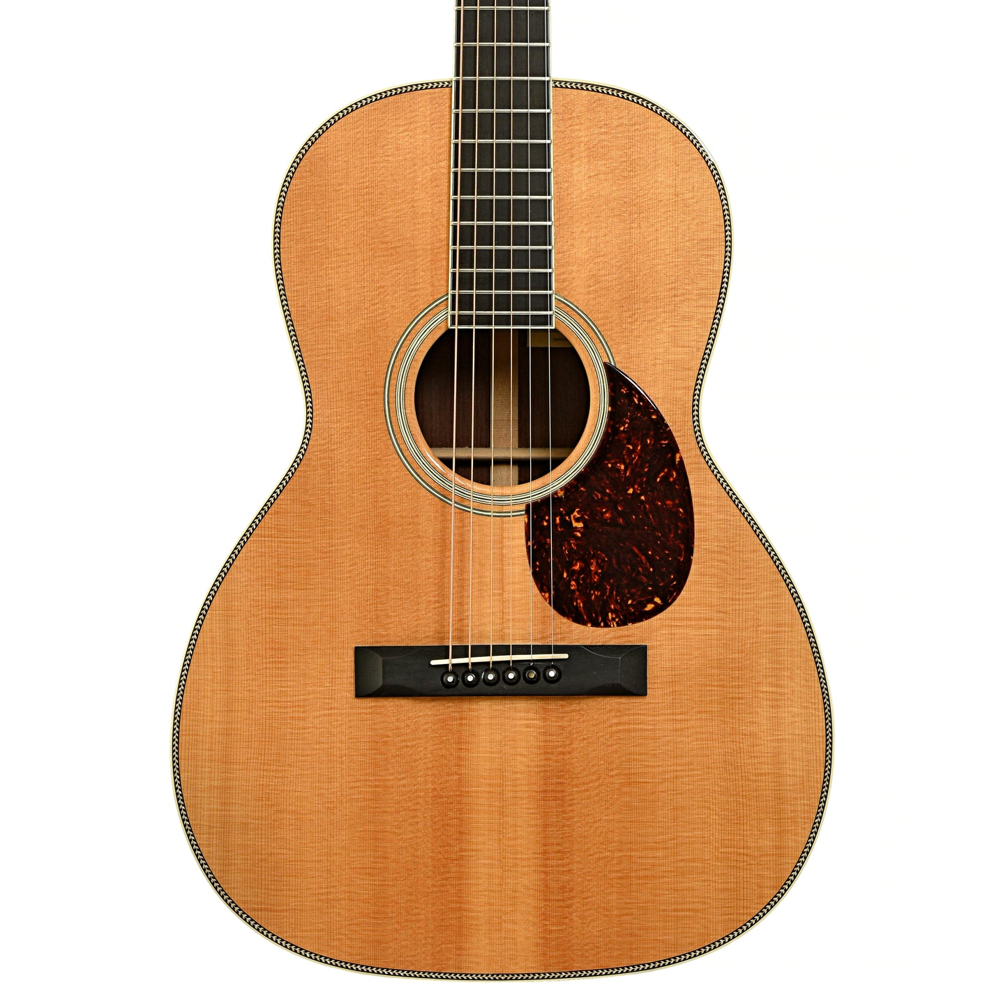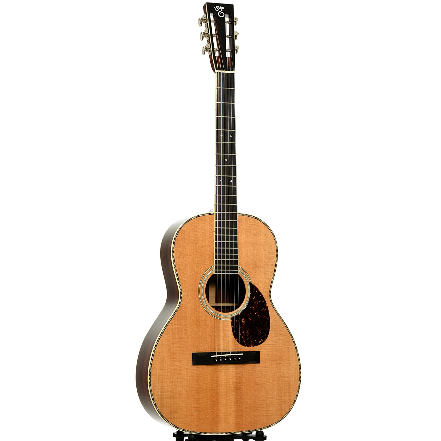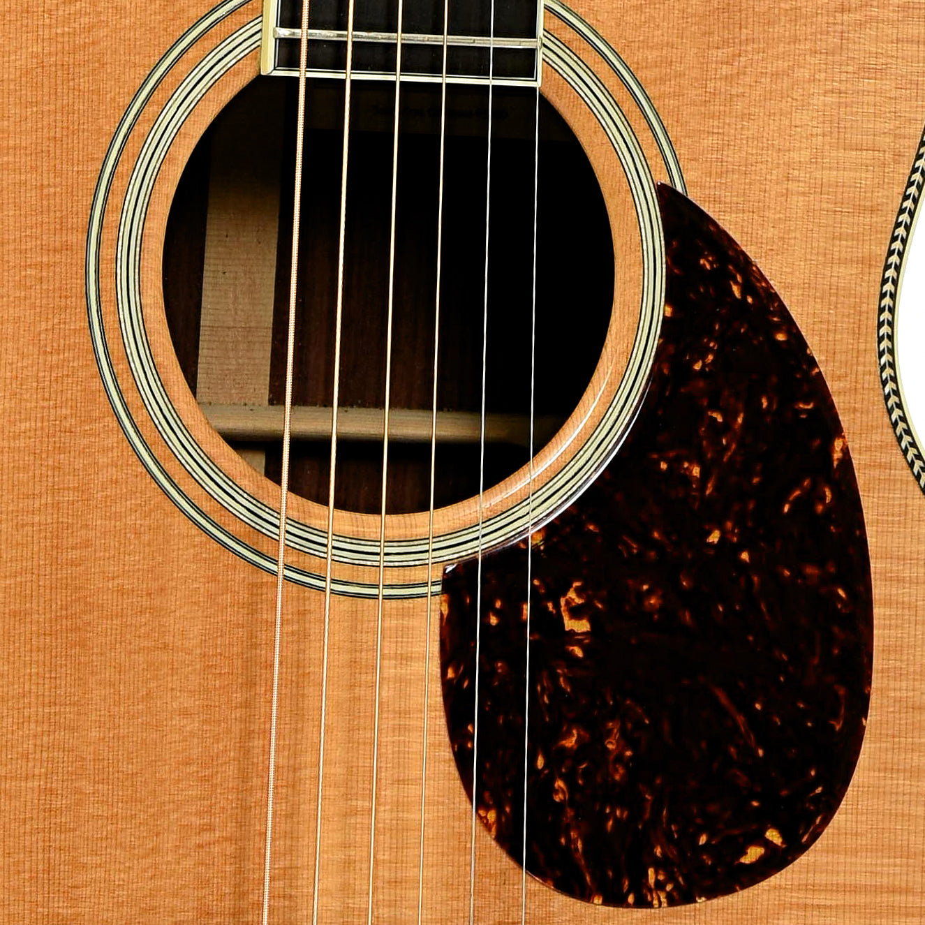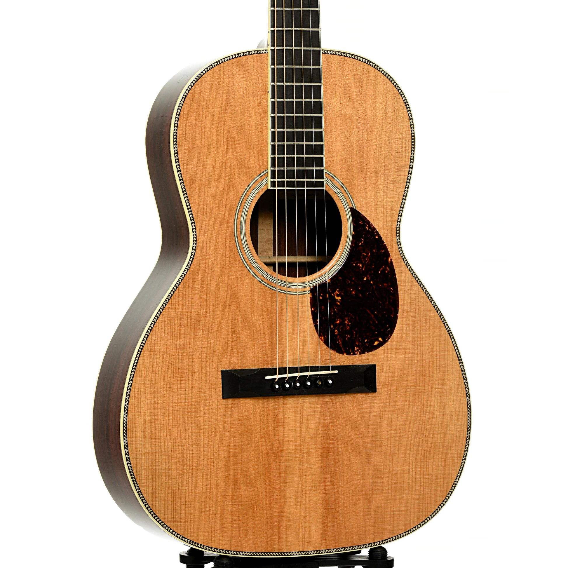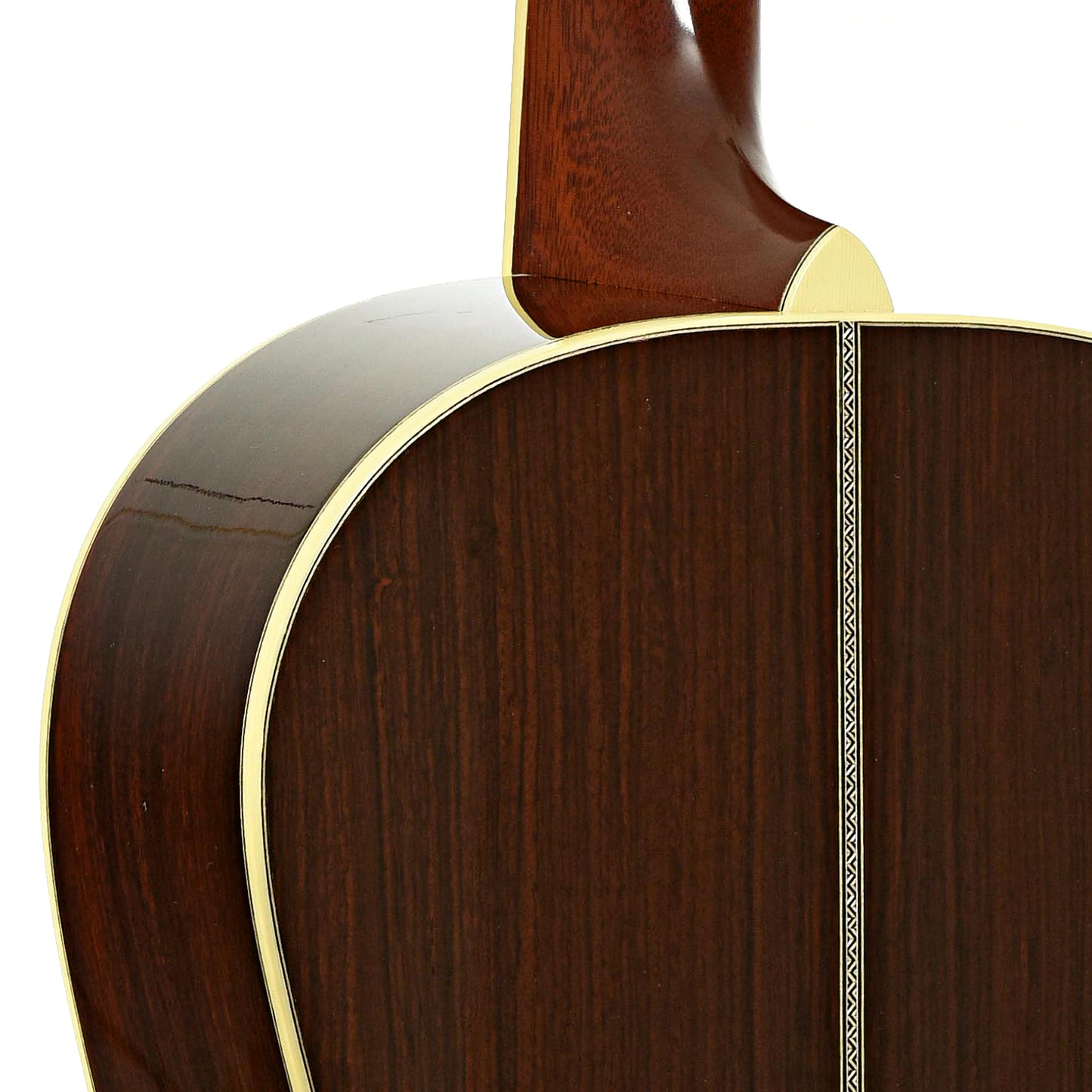 - Herringbone top purfling, multi-stripe rosette, ivoroid binding