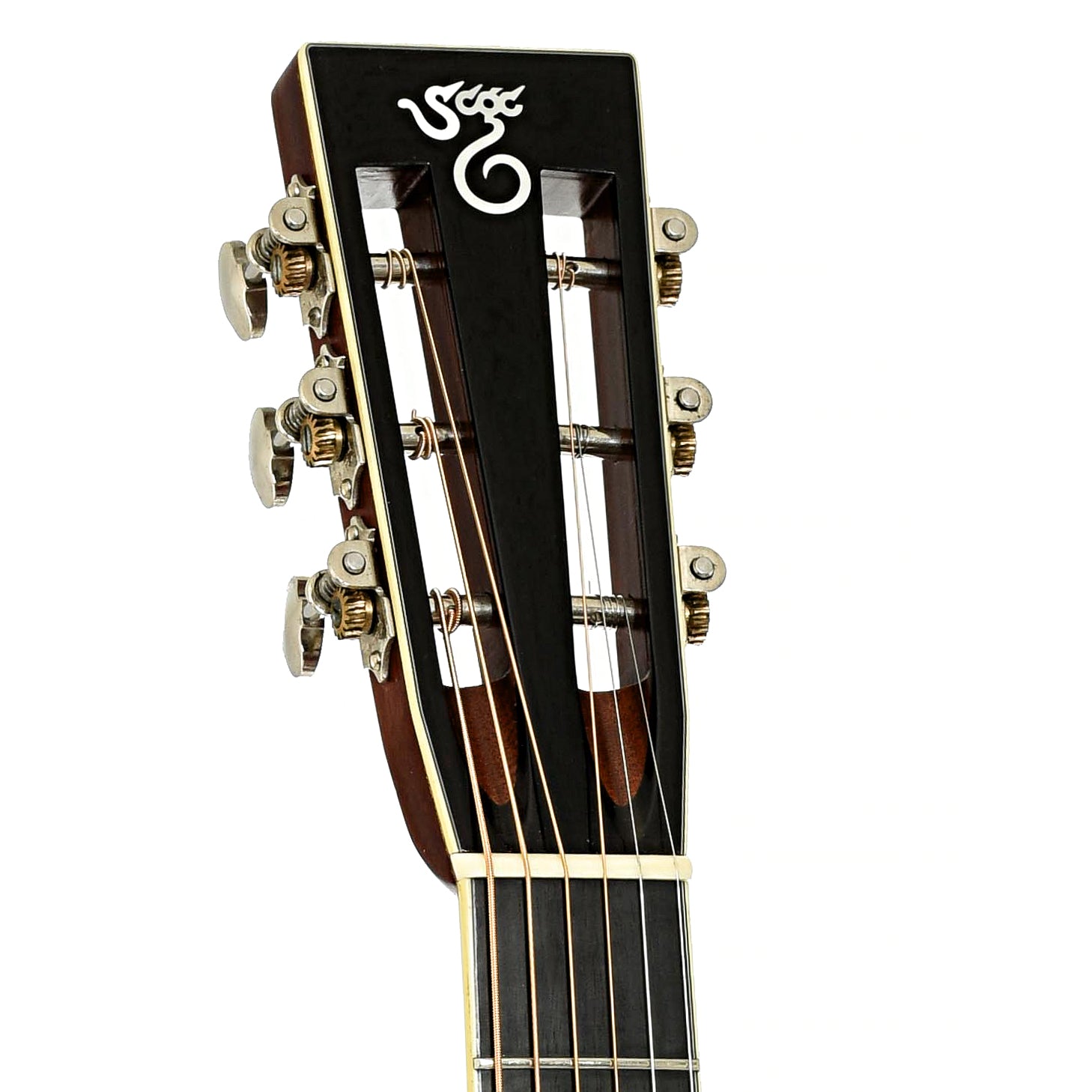 - Bound ebony slotted peghead overlay features pearl logo