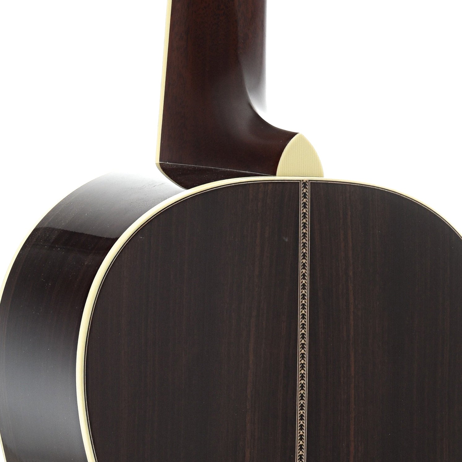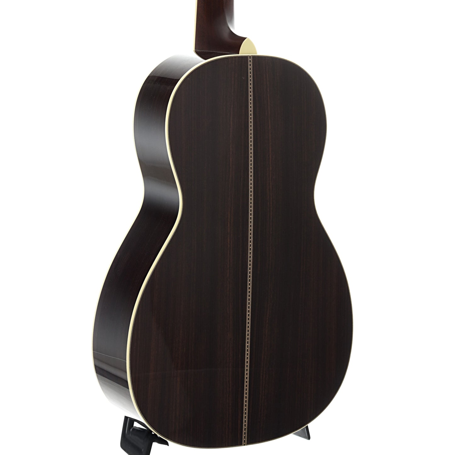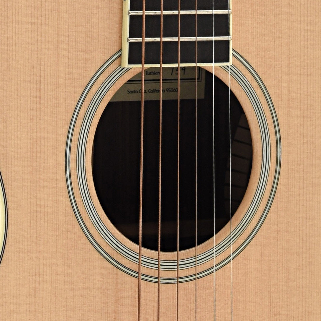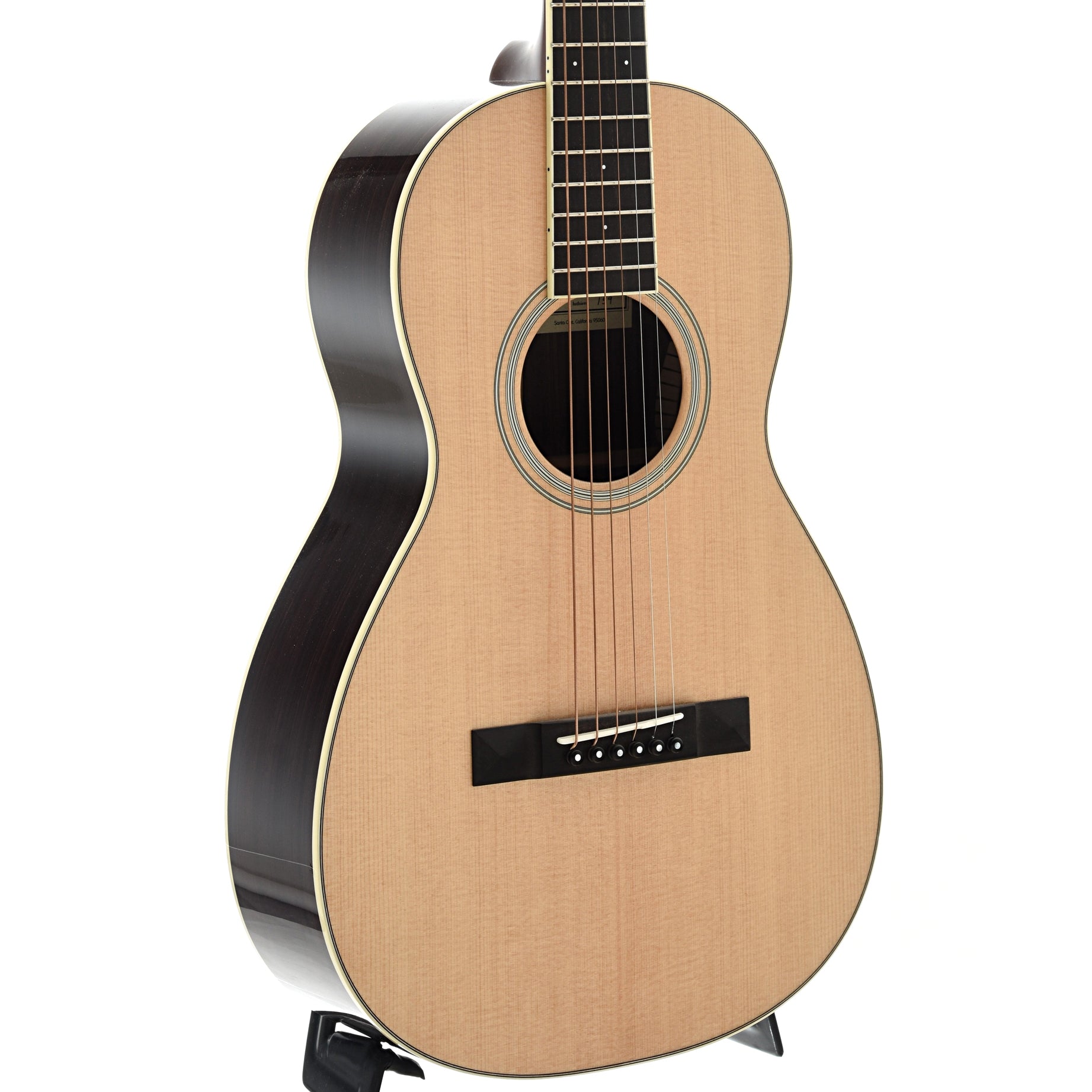 PARLOR SIZE 12-FRET - Body of Indian rosewood, Sitka spruce top with scalloped braces, ivoroid binding, black/white top trim, ebony pyramid bridge. V-shape neck joins body at 12th fret, bound ebony fingerboard (1-11/16" nut, 24" scale), small dot position inlays. Body dimensions: 18" long / 12.5" wide at lower bout / 4" deep. Santa Cruz hardshell case.
