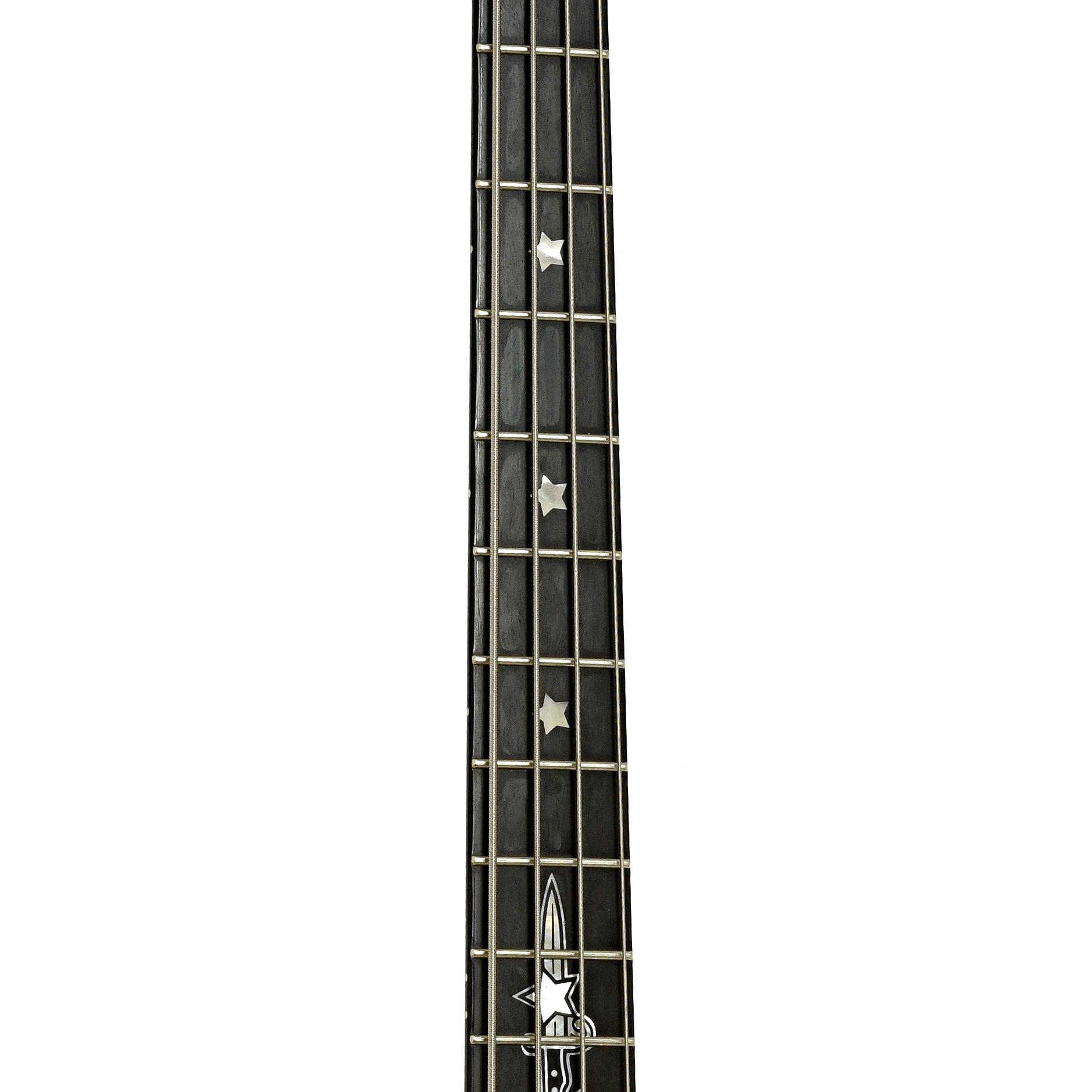 A sleek black bass from Schecter's Diamond series. Built with a solid mahogany body, mahogany set neck, and ebony fingerboard featuring Mother of Pearl “star and dagger” inlay. Sporting a contoured body shape unique to Yseult’s signature model that remains comfortable and well-balanced in hand. Equipped with dual active EMG pickups, two volume controls, and chrome hardware, including a Schecter custom string-thru bridge. Coffin case included (quilted red lining). Import.