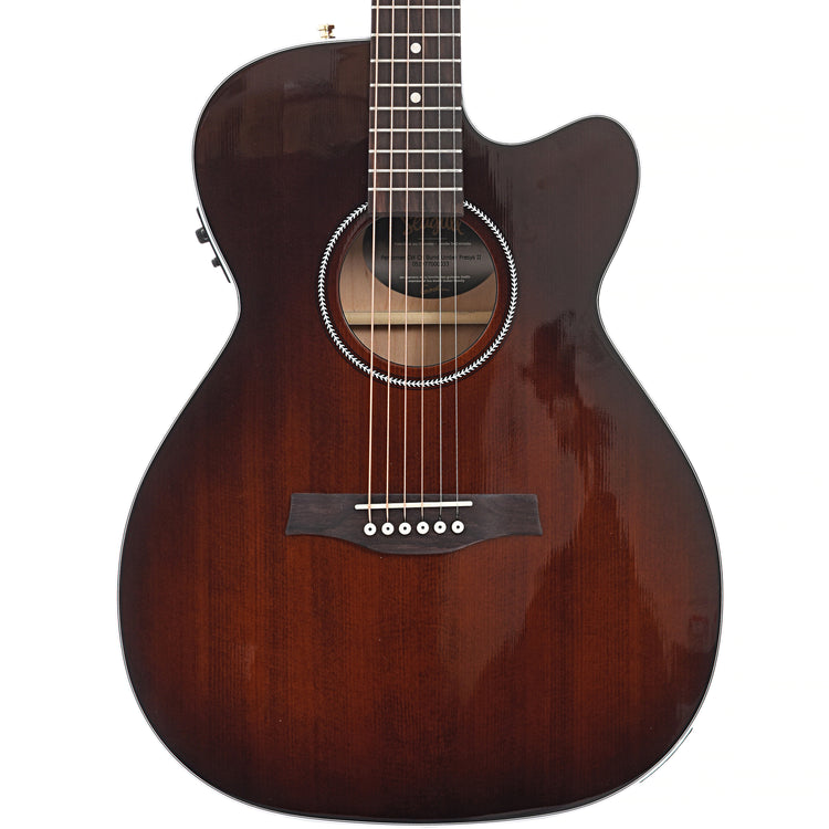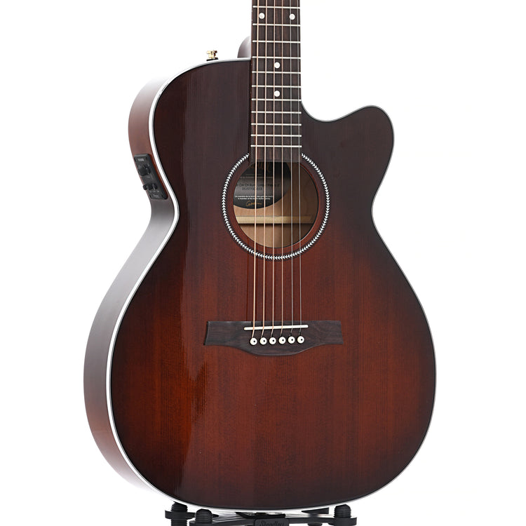 Solid spruce top with cutaway and burnt umber gloss finish, flame maple back and sides, rosewood fingerboard and bridge, maple neck, 1.8" nut width, 25.5" scale length, Tusq nut and saddle, Quantum I pickup system, gigbag included.