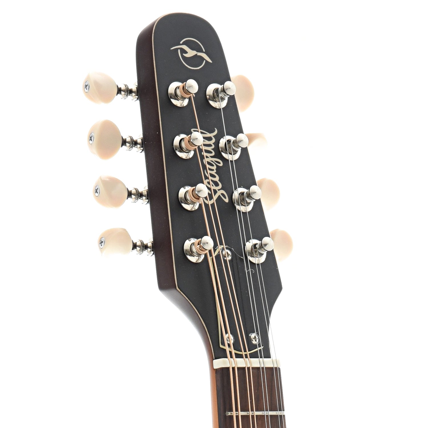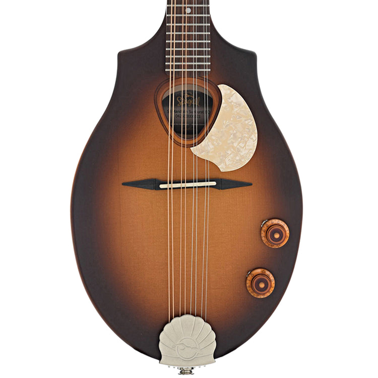 Double cutaway style acoustic mandolin with B-Band pickup and EQ, solid Sitka spruce top, maple neck through laminate maple body, rosewood fingerboard, semi-gloss finish, Tusq nut, bridge and compensated saddle by GraphTech, open geared tuners, vintage style nickel plated brass tailpiece, 13.875" scale length, 1.19" nut width, sunburst finish.