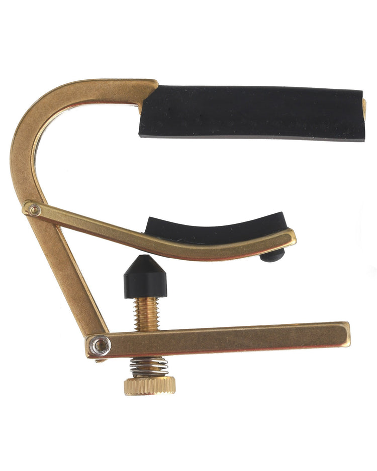 Skips the sixth string (low E) and covers the other five, emulating a drop-D tuning, brass.