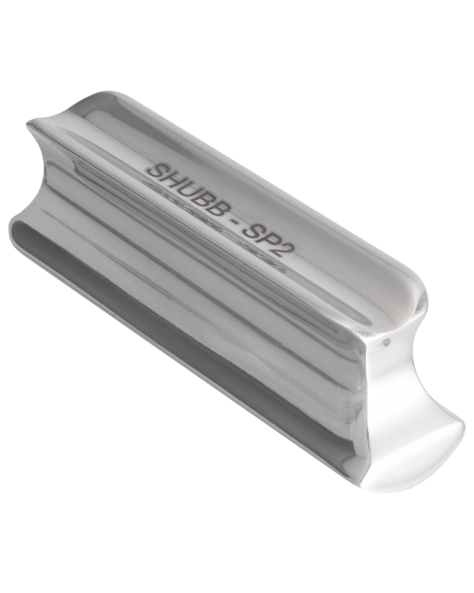 The Shubb Pete Grant SP2 steel is a variation of the original Shubb-Pearse slide. This version has a cutaway on both ends for better control and is a little heavier, for better tone. A very versatile dobro or lap steel slide. About 5.6 oz., 2-7/8" long.
