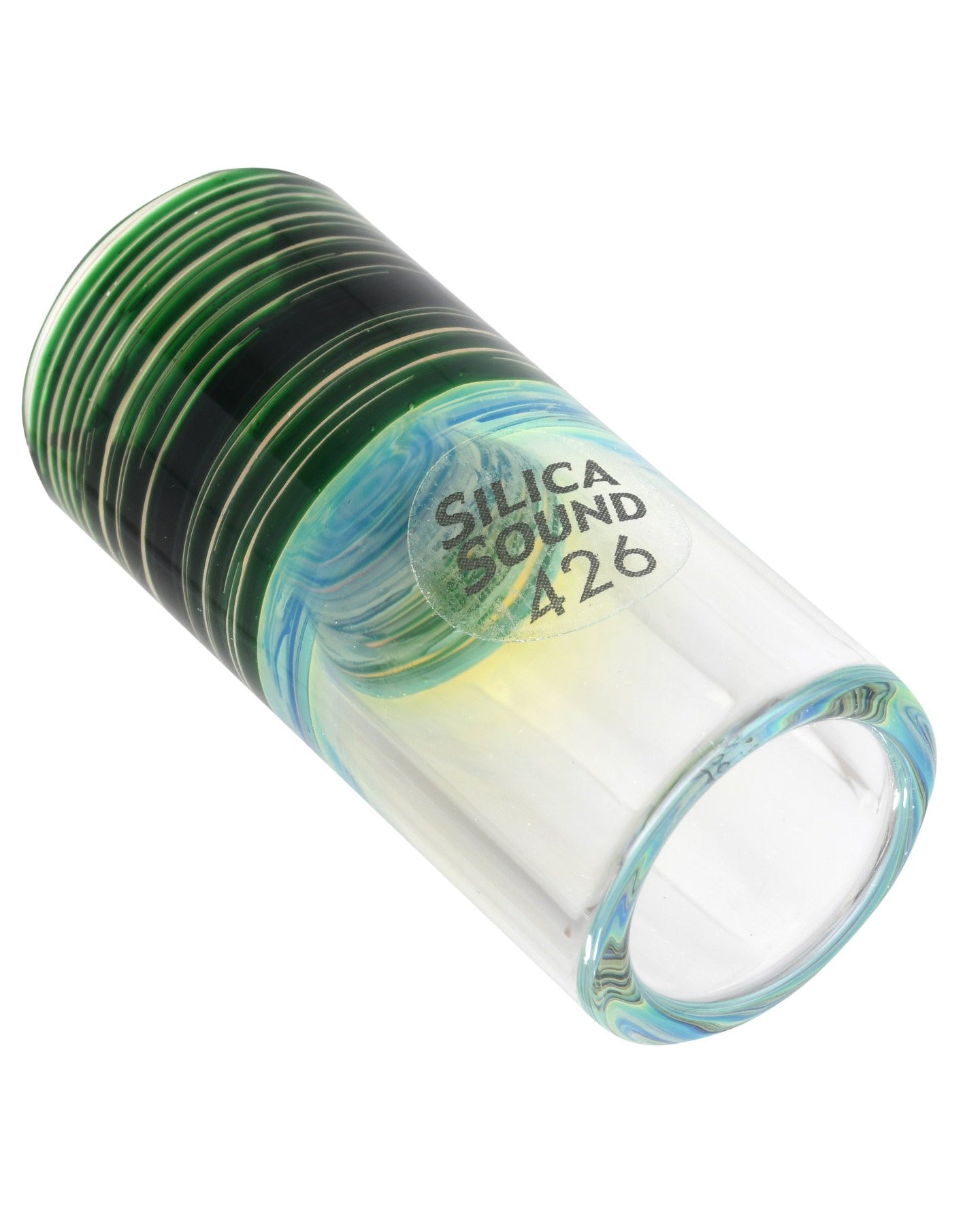 The Silica Sound 426 bottleneck slide is is handblown and has a thickened end to promote a unique grip on the tip of your finger, while providing added mass for better sustain. Each one has a colorful, artistic design (sorry, no choice). The wall is 4.0mm thick, with an outer diameter of 30.0mm, and an inner diameter of 22.0mm. The length is 2.6". No two slides look exactly the same and the taper varies on each slide, some thicker, others thinner.