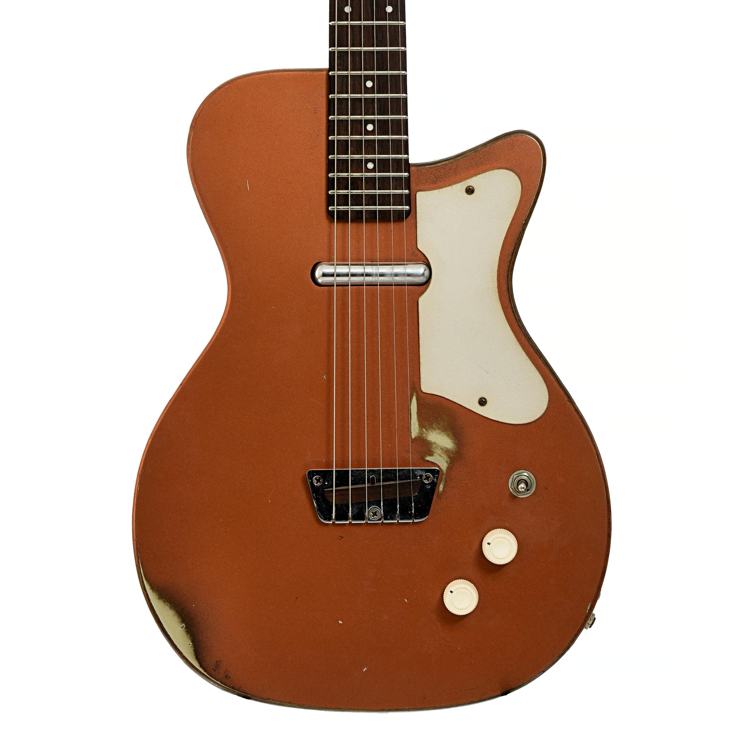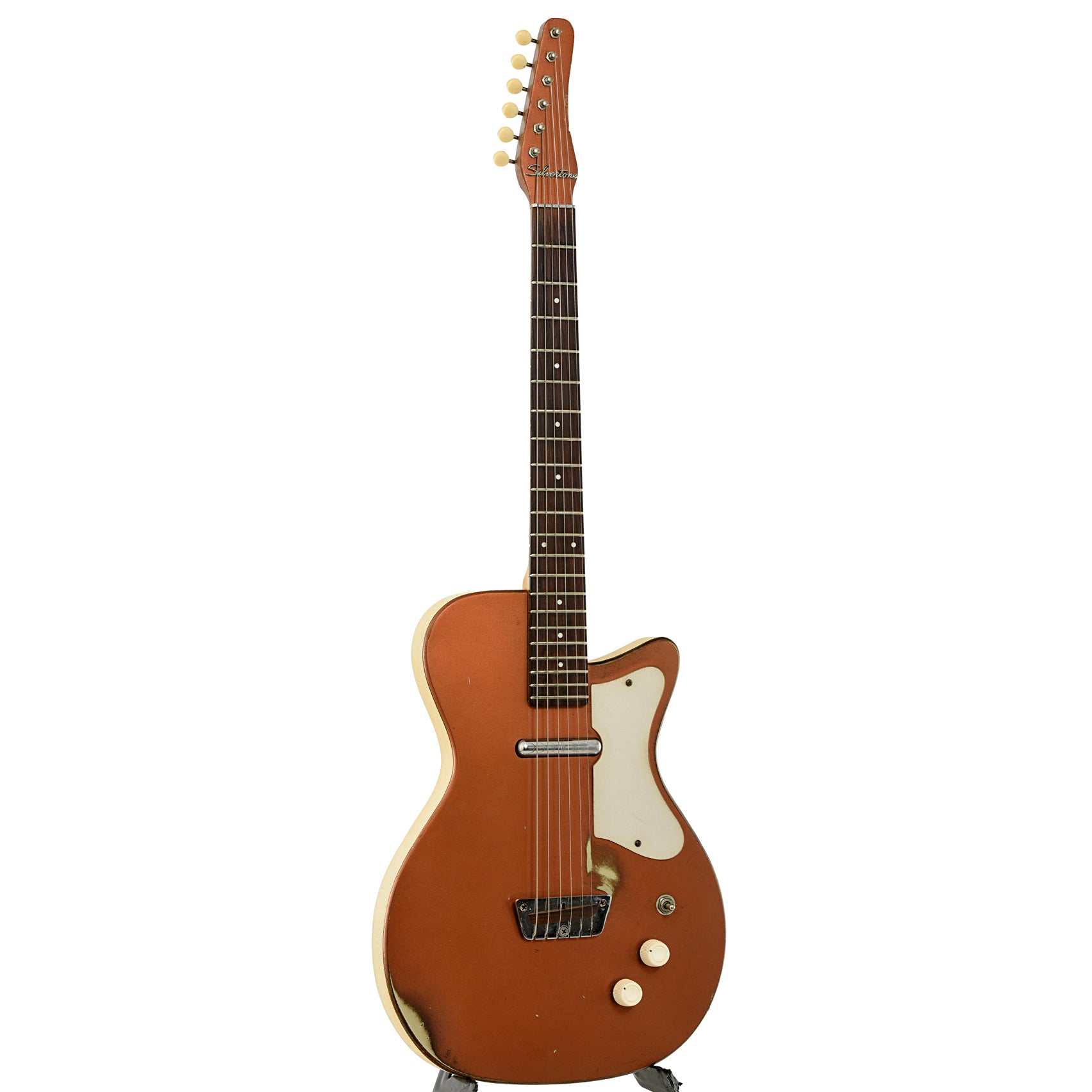 This Silvertone U-1 is a cool blast from the past, featuring the classic copper sparkle finish and vinyl sides on a Masonite/poplar single-cutaway body. It has a Brazilian rosewood fingerboard and saddle, along with the iconic "Dolphin" headstock with chrome logo. Equipped with a lipstick single-coil pickup. Comes with a Taylor gigbag. Made in USA.