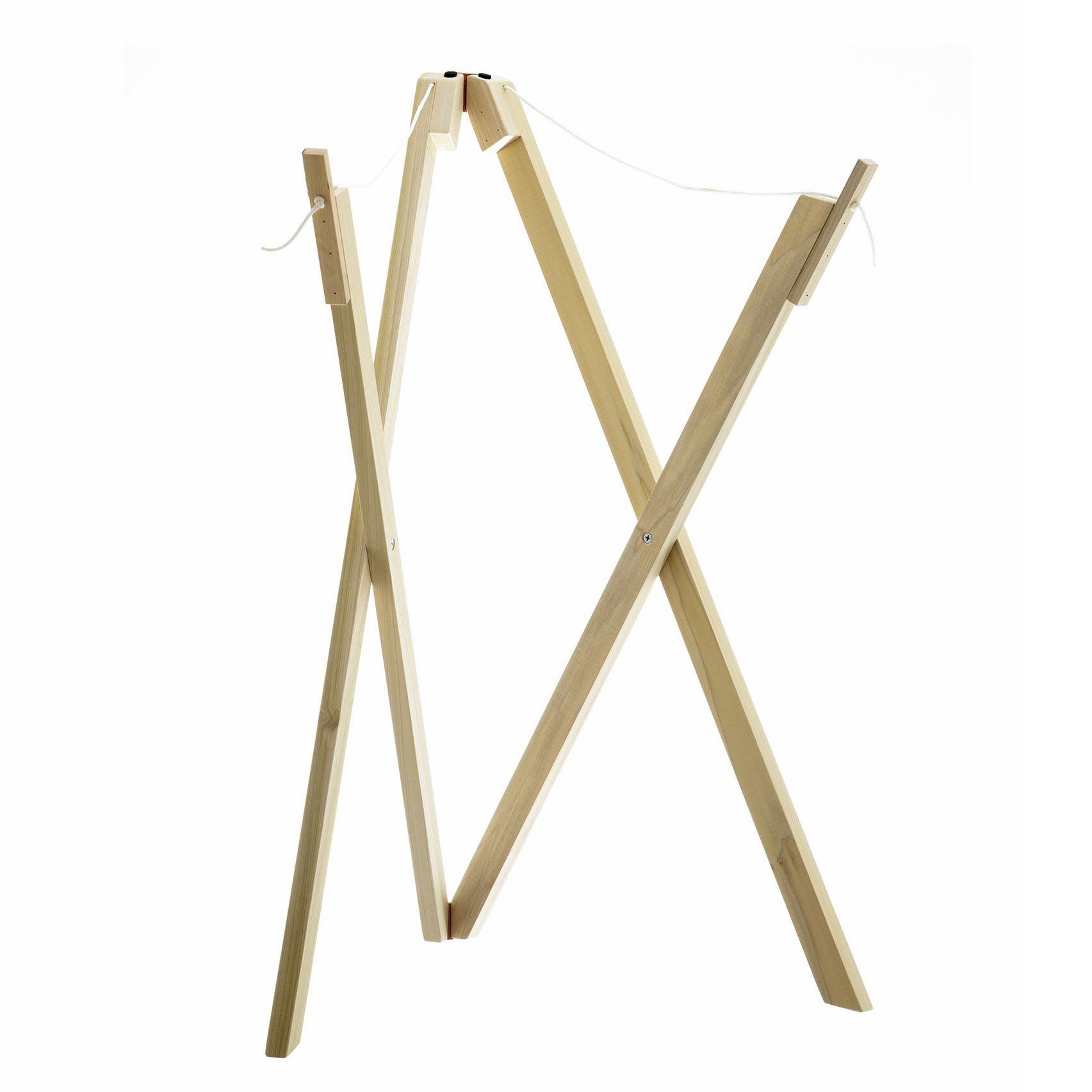 Songbird's Adolescent Stand for people 4’6″ – 5’3″ tall. Holds lower edge of dulcimer body at about 29-1/2". Raise it an inch or so by shortening the cords. Folds to approx 39-1/2" x 3-1/2" x 2-1/4"