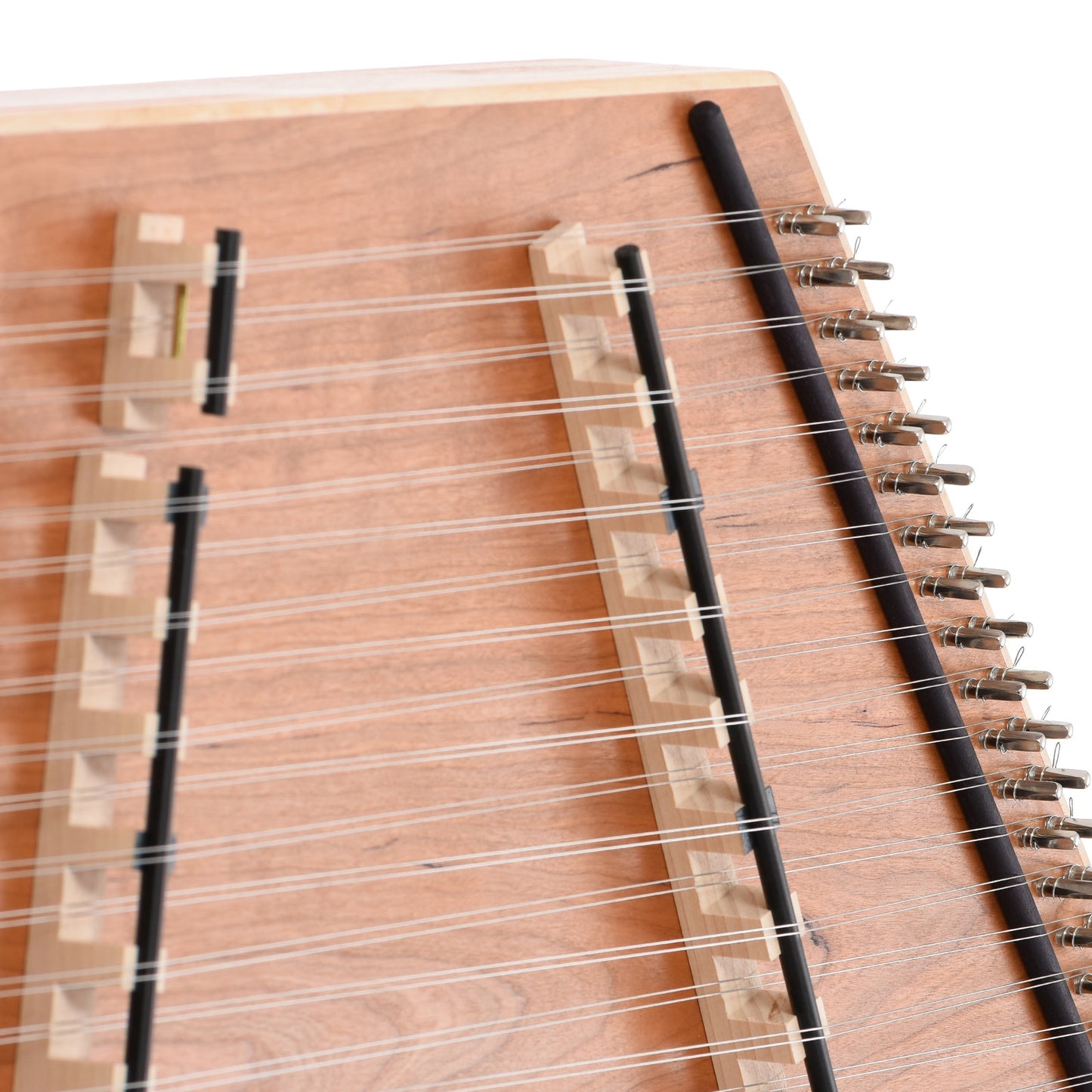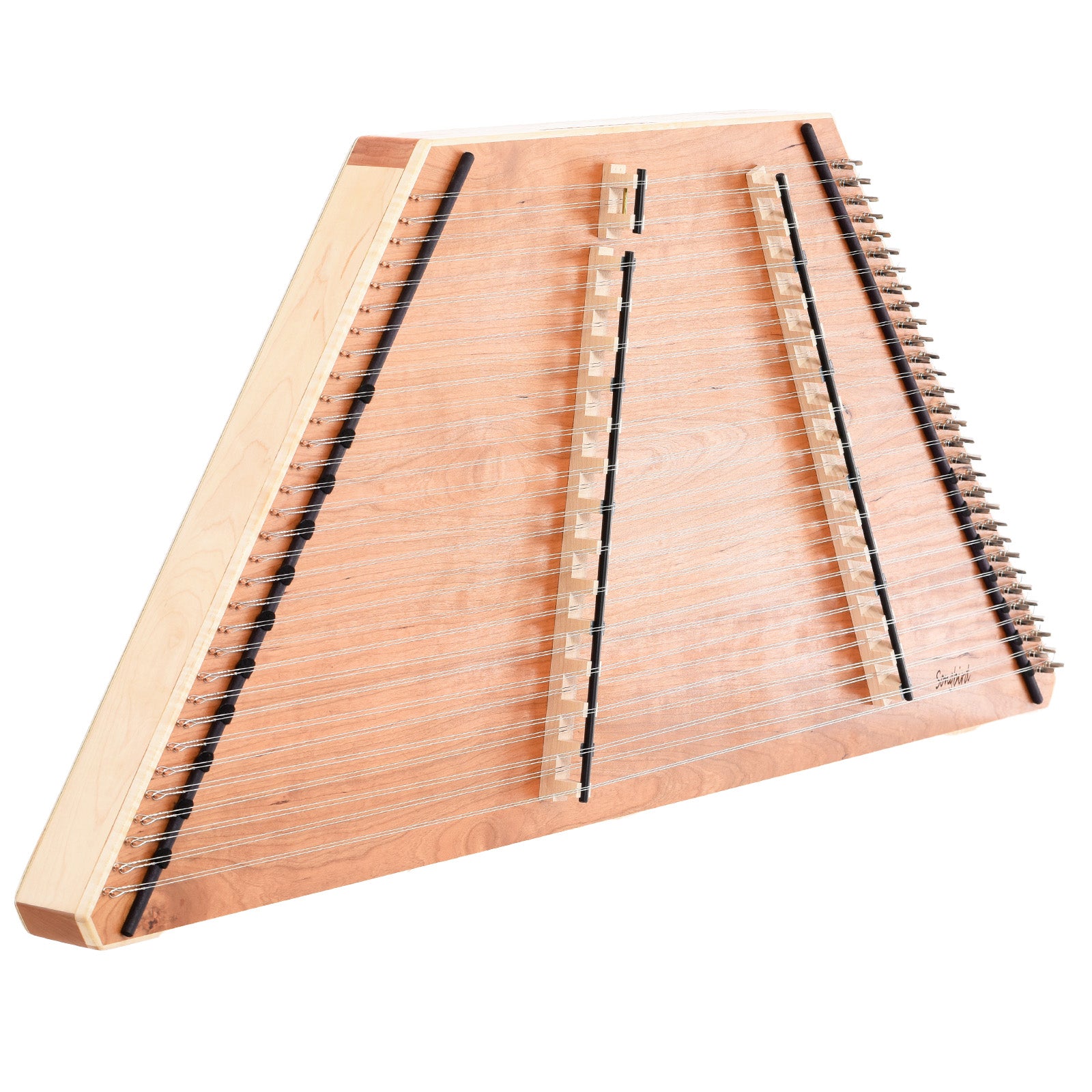 This full-size dulcimer is great for the beginner with a larger budget. Seasoned players looking for a dulcimer that holds its tune to take to jams and festivals will like it also. Top is a lovely cherry veneer, soundholes are on the back. With 16 treble courses and 15 bass courses it offers a range of over 4 octaves starting at a low D.
