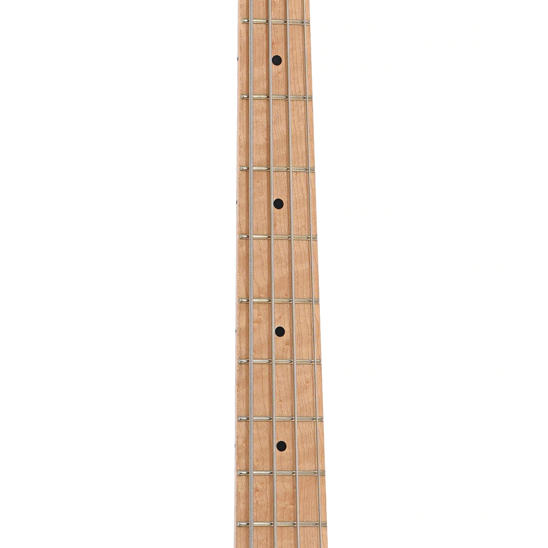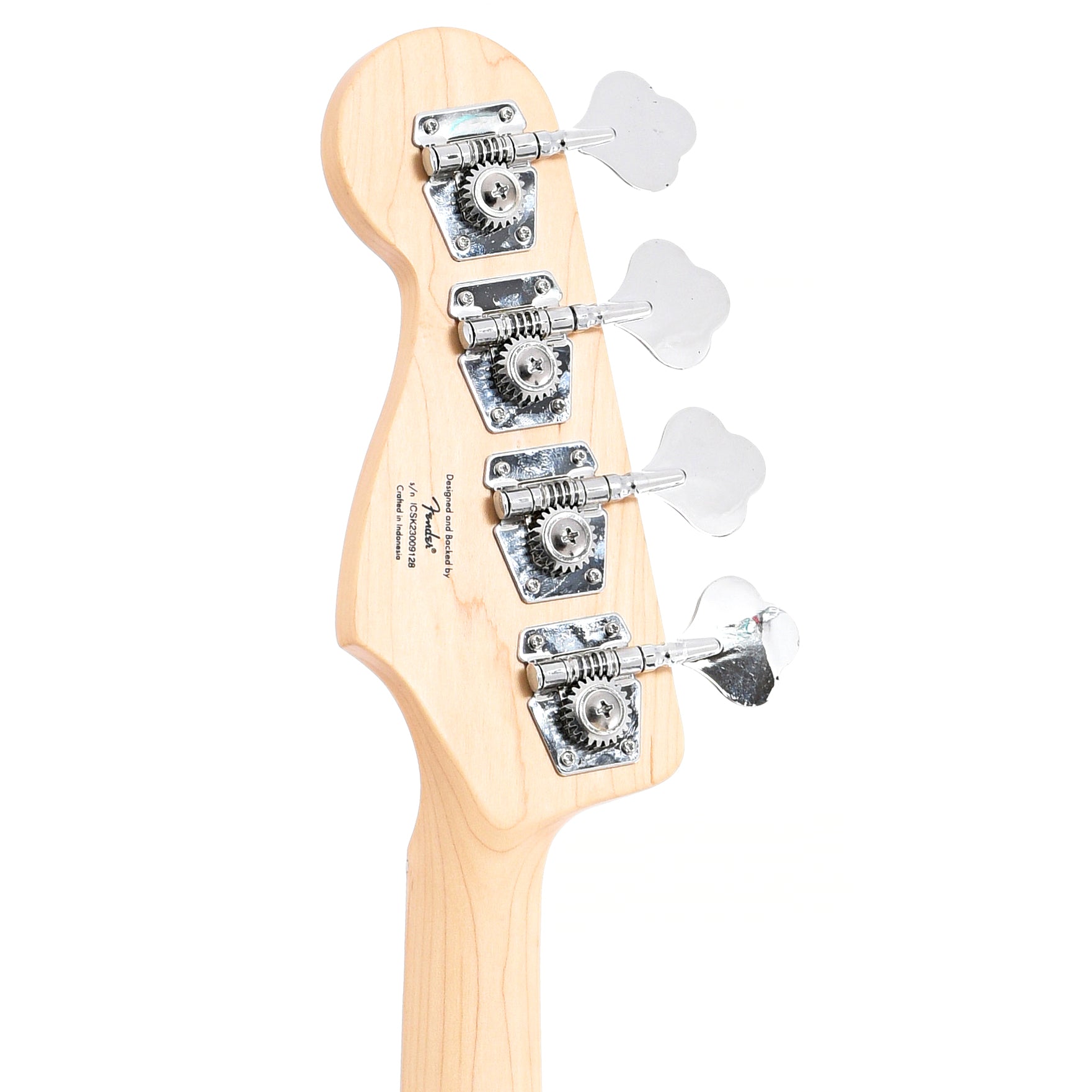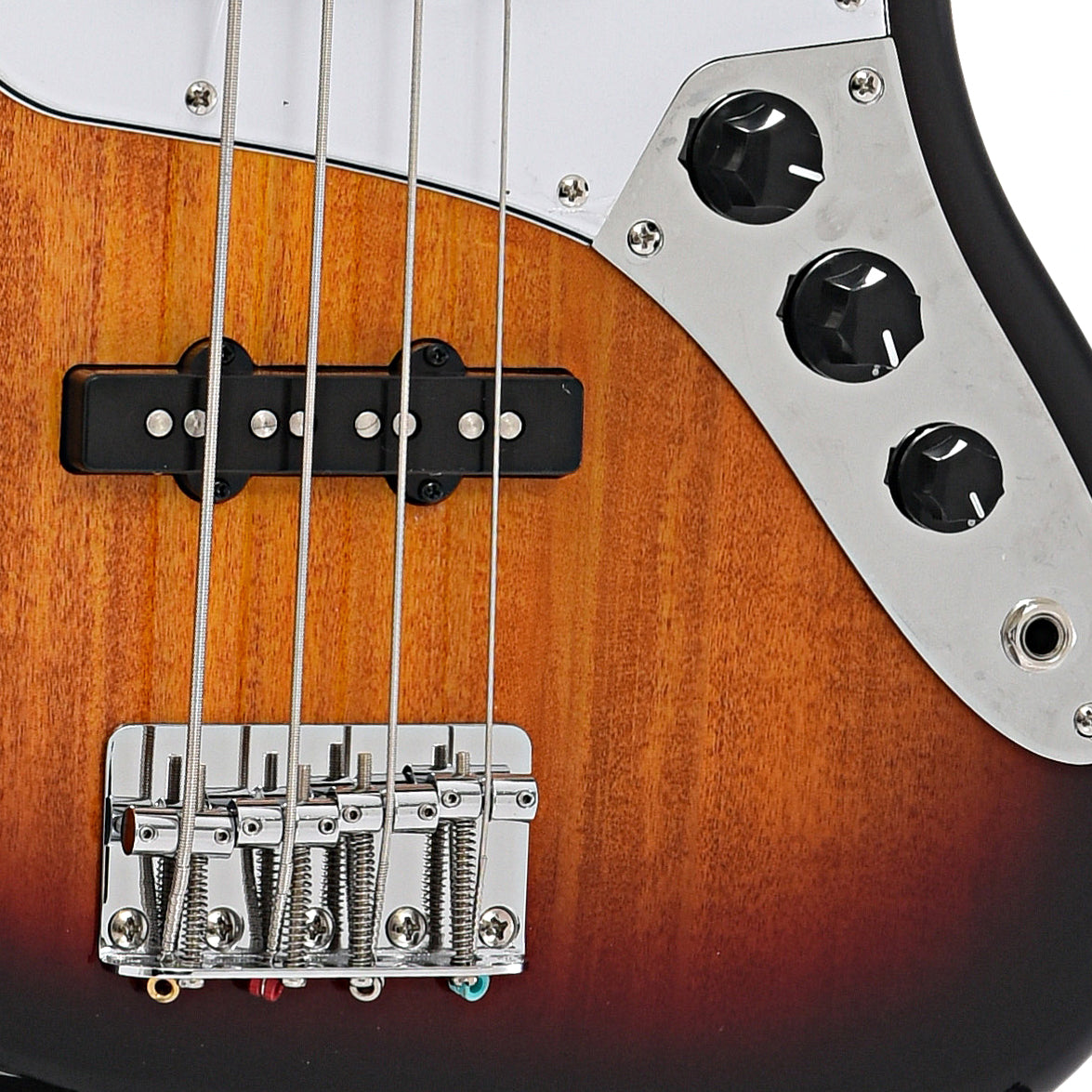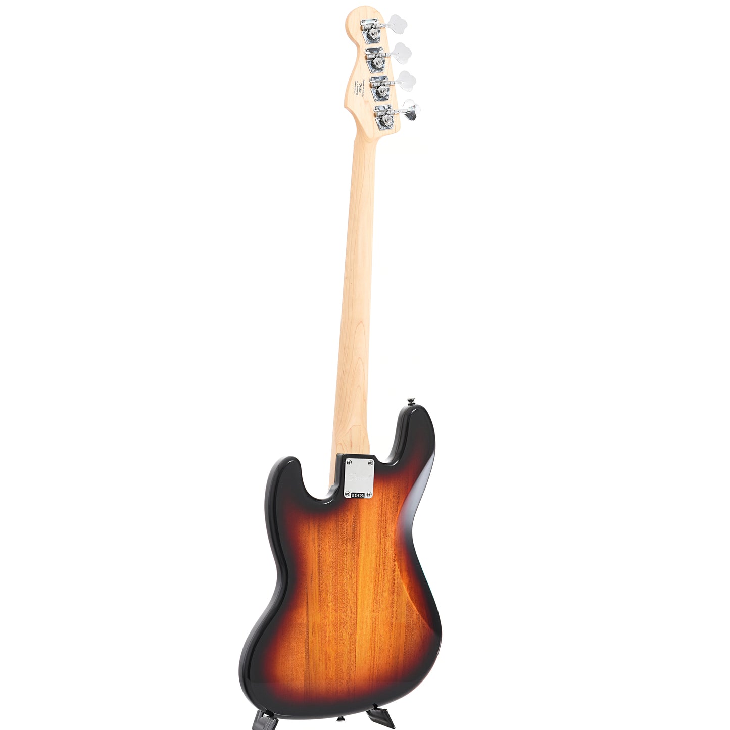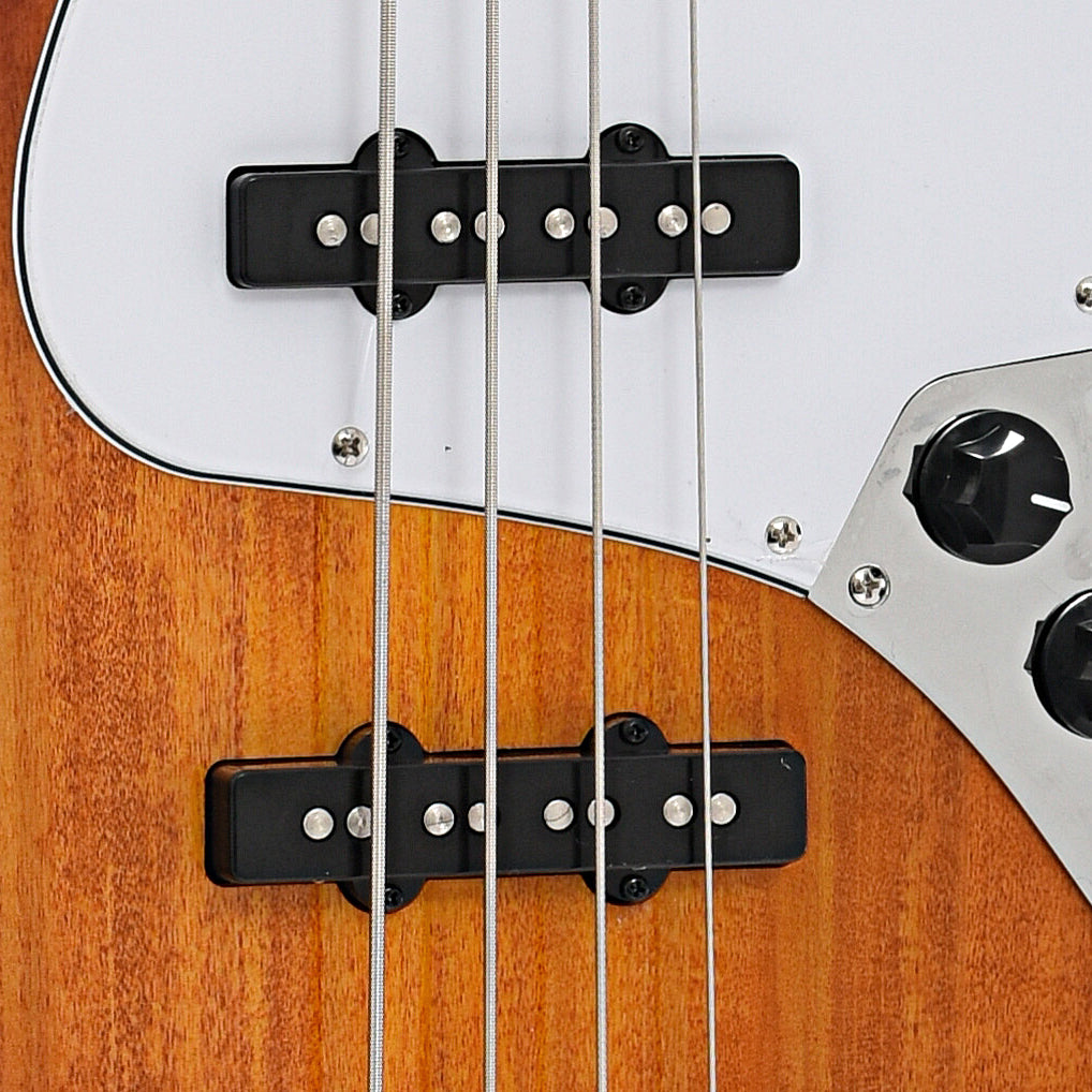 Brown sunburst poly finish, alder body, C-shape maple neck, laurel fingerboard with 20 medium-jumbo frets, 9.5" radius, 34" scale length, 1.50" nut width, single-coil Jazz Bass bridge and middle pickups, 2 volume, 1 tone, standard open gear tuners, 4-saddle bridge, chrome hardware and a 3-ply white pickguard. Less case, made in China.
