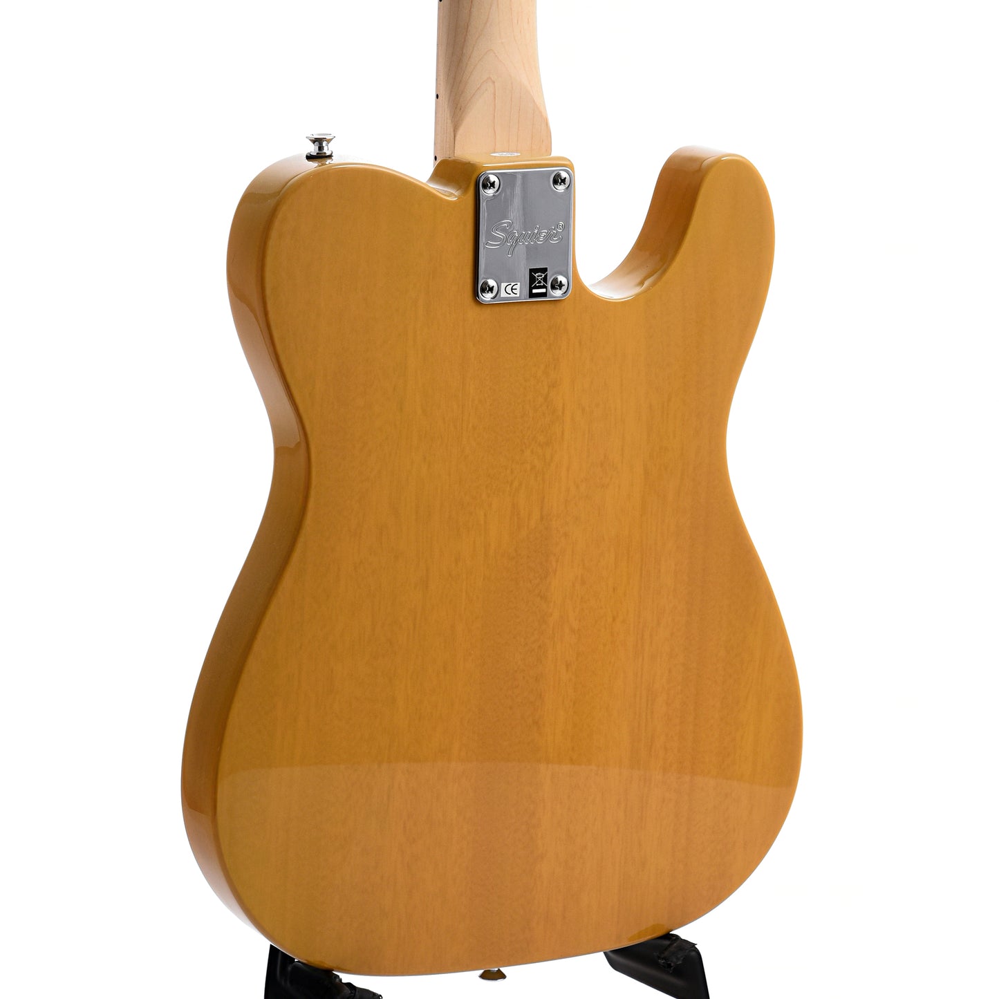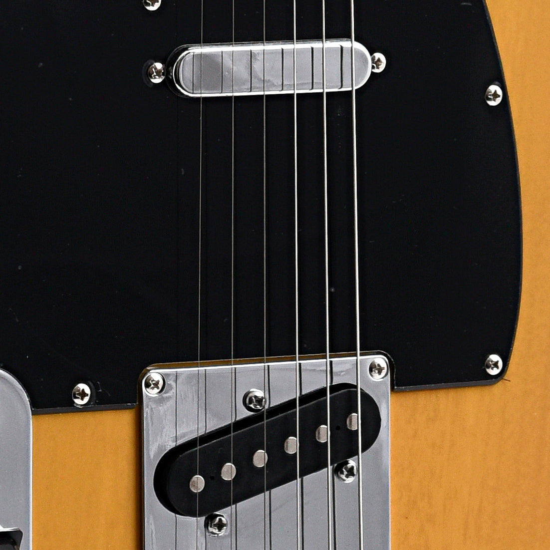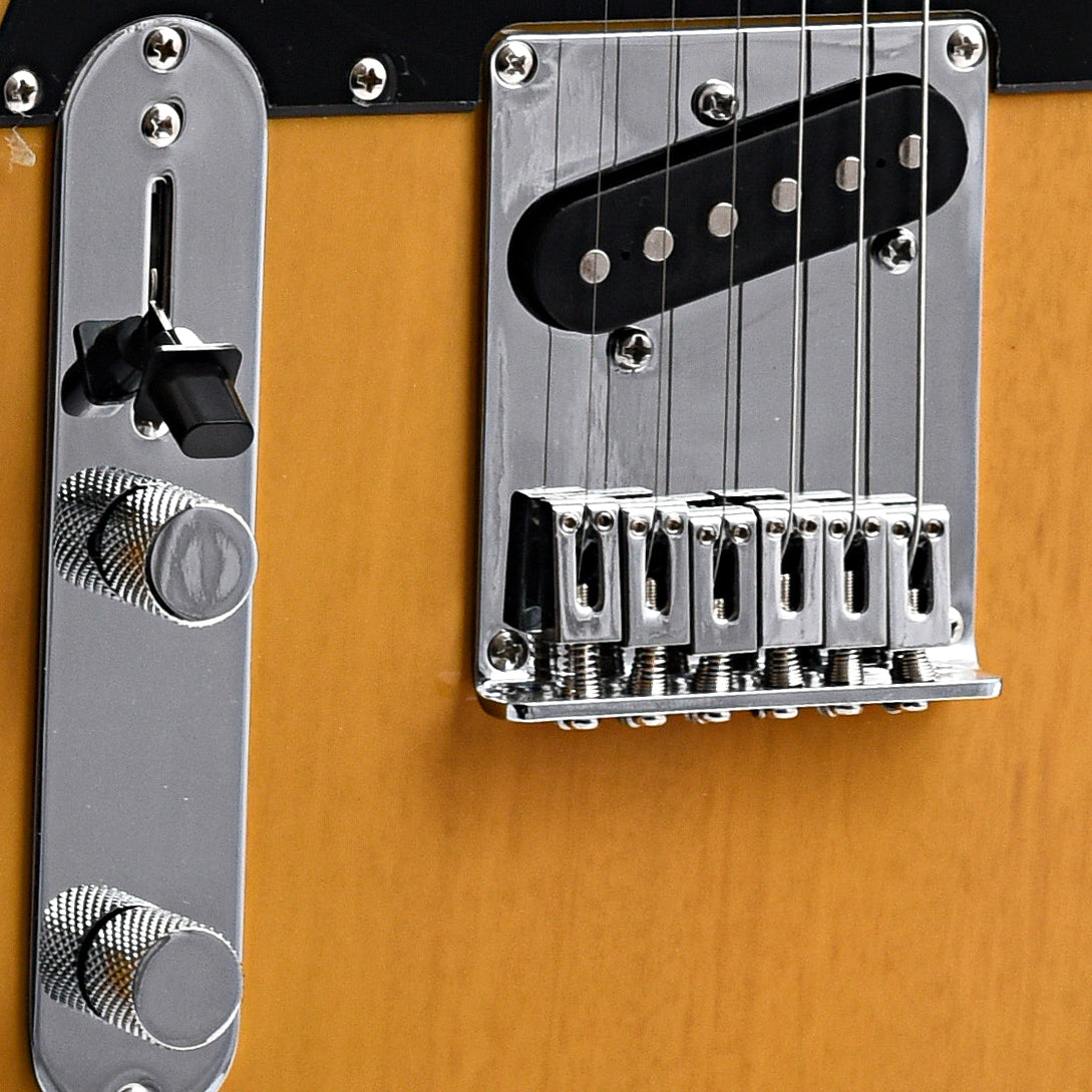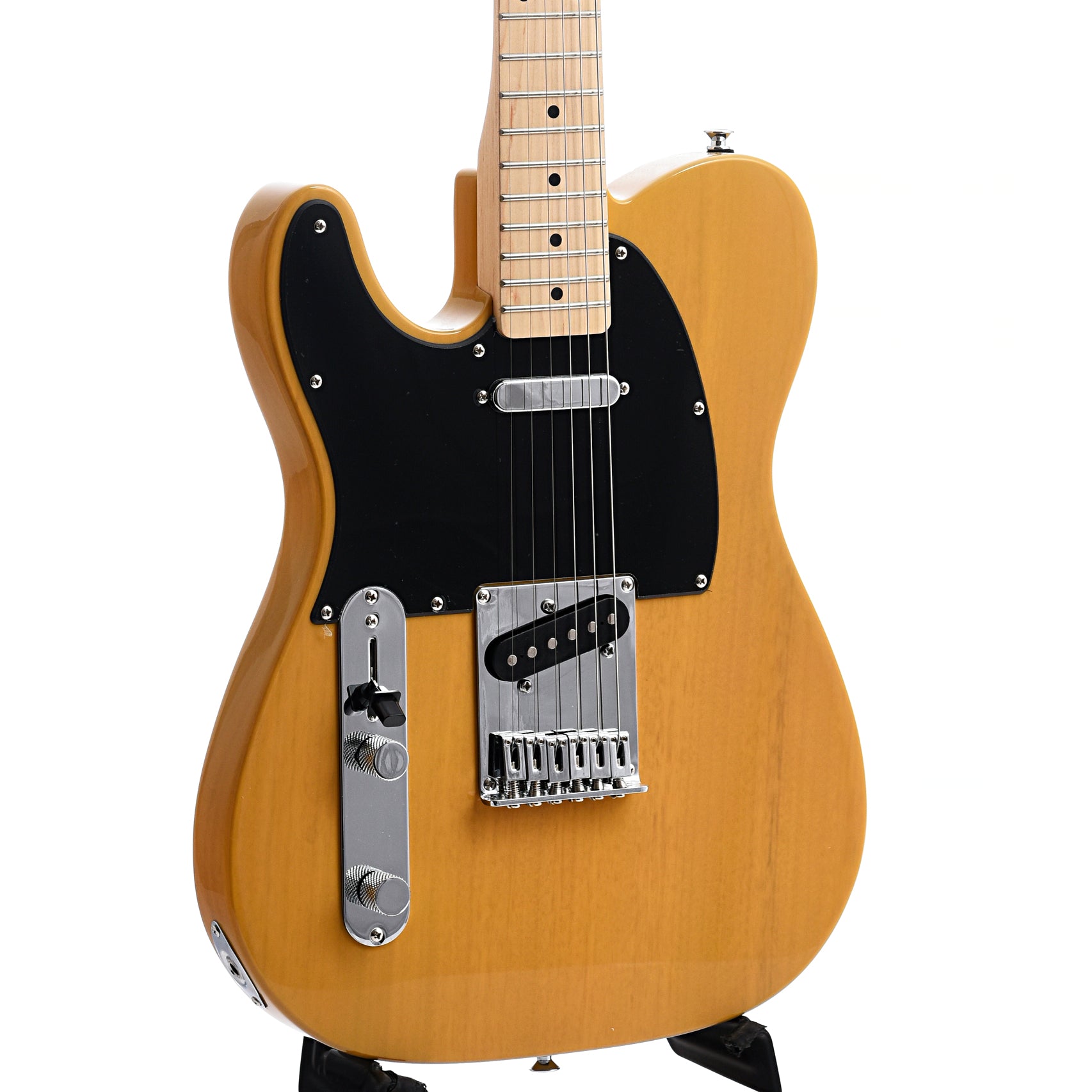 Butterscotch blonde finish, alder body, C-shape maple neck with maple fingerboard, 21 medium-jumbo frets, 9.5" radius, 1.61" nut width, 25.5" scale length, two single coil pickups, die-cast tuners, chrome hardware and a black pickguard. Less case, made in China.