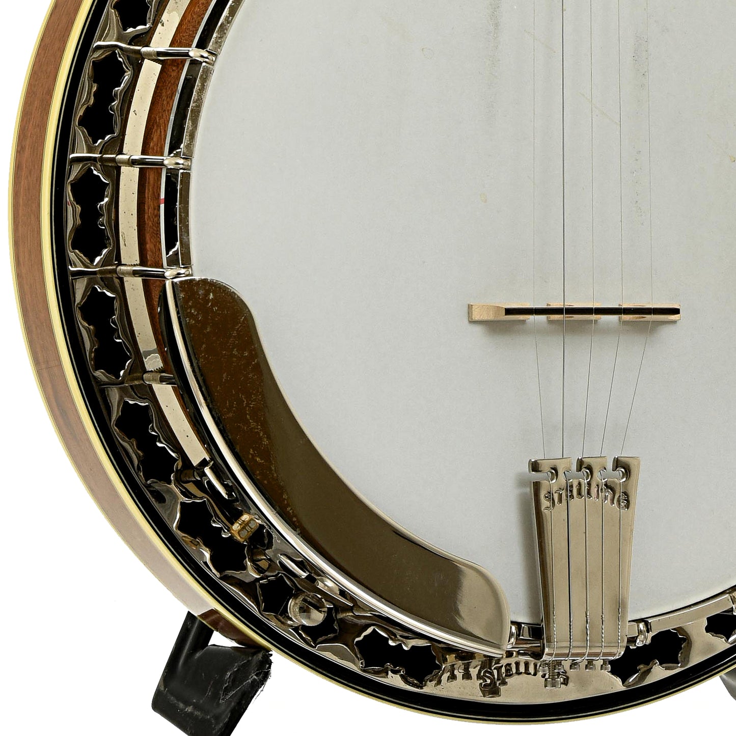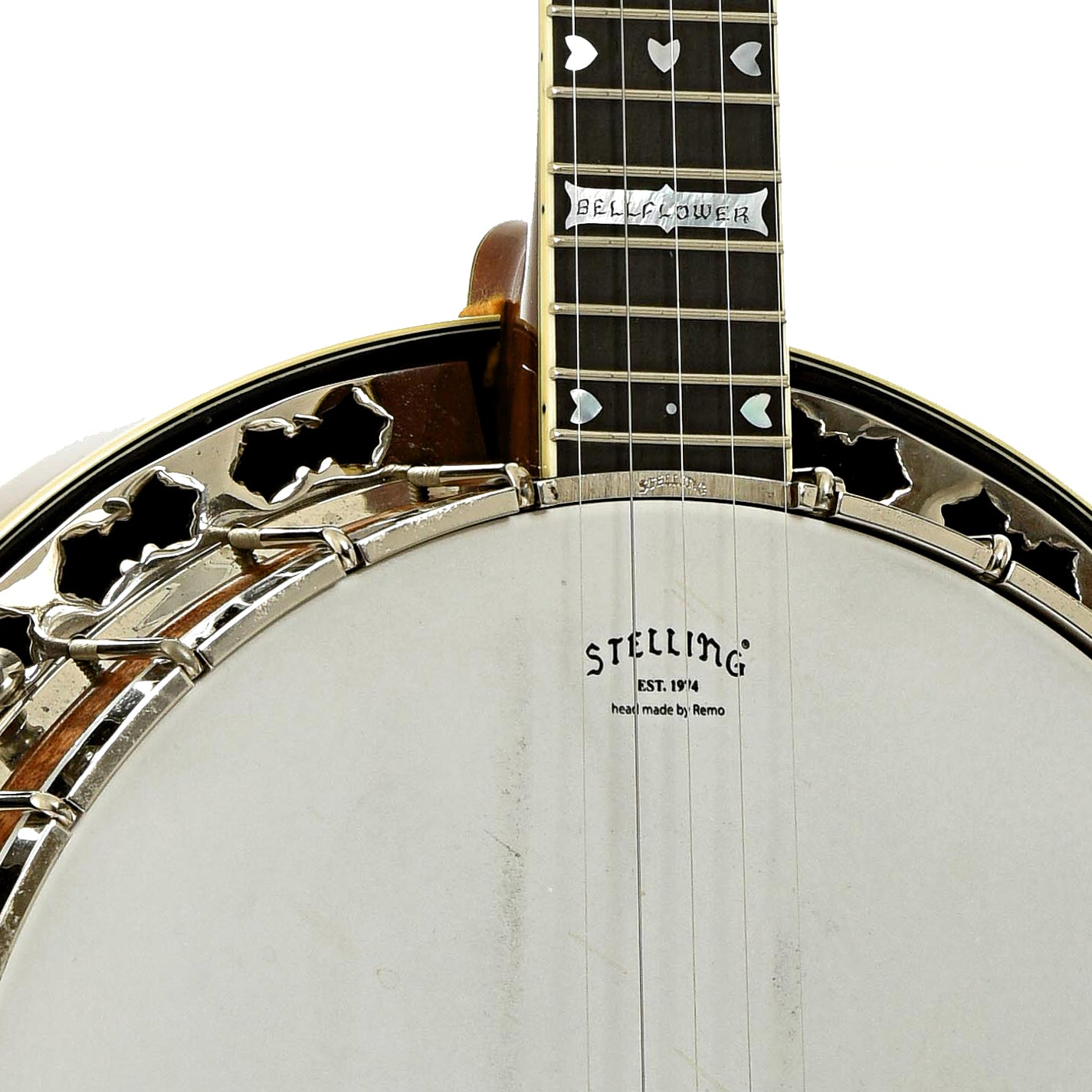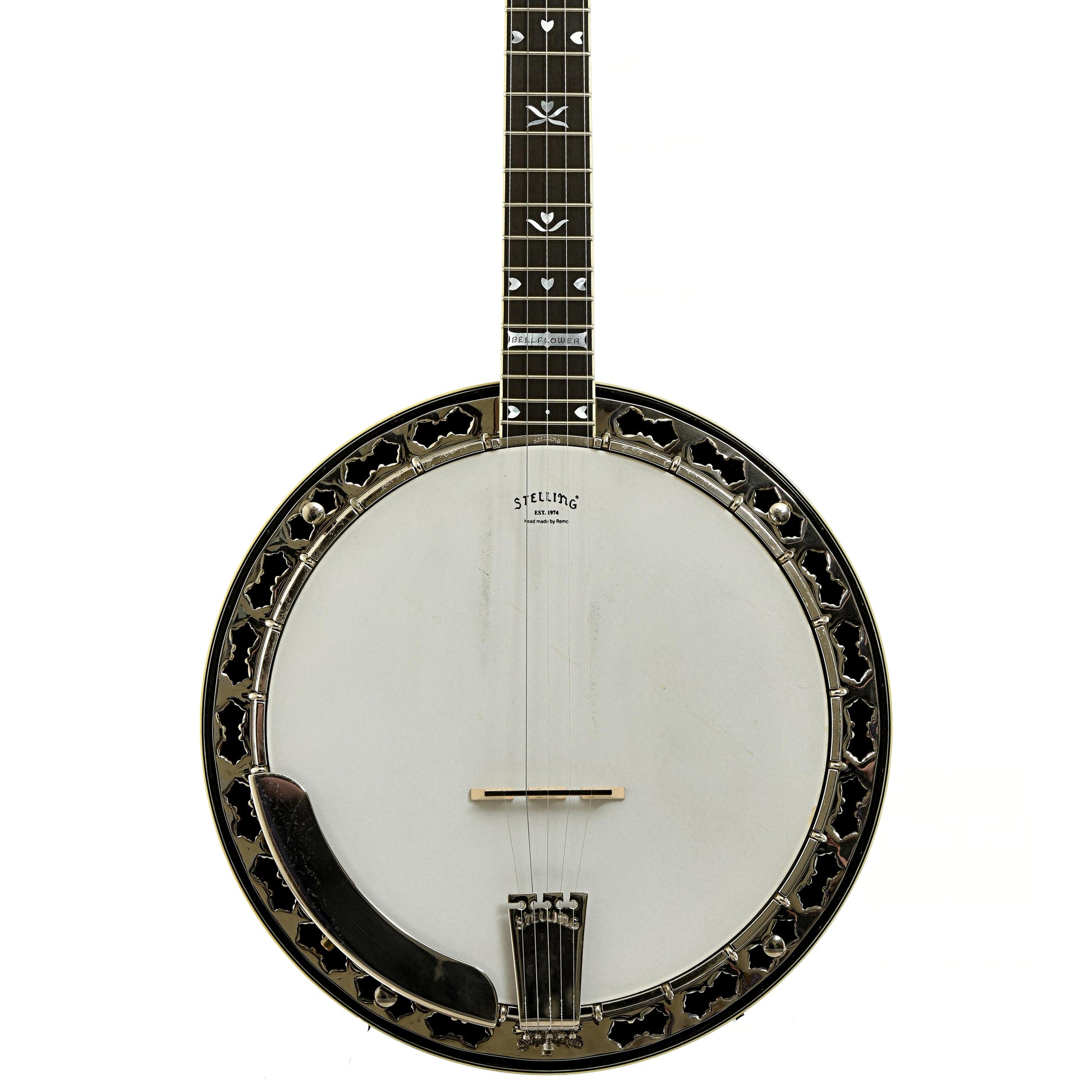 From a big name in bluegrass banjos, this Bellflower features the Stelling wedge-fit tone ring, a Tony Pass Lost Timbre block maple rim, a walnut resonator and neck, and an ebony fingerboard. Pretty appointments of pearl floral inlays and ivoroid binding. Huge volume and tone! Original hard shell case. Made in USA.