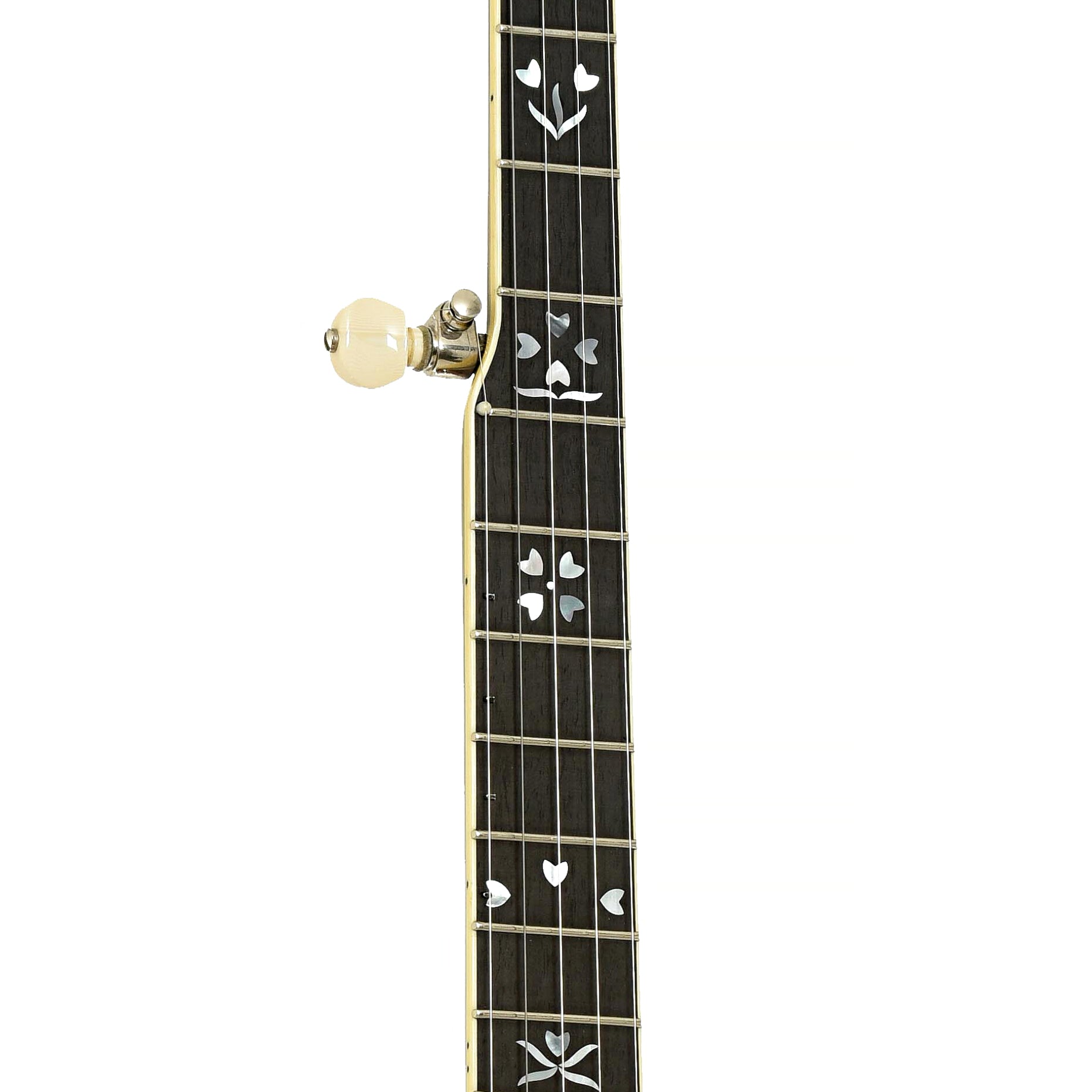 - Bound ebony peghead overlay features pearl logo and floral inlays