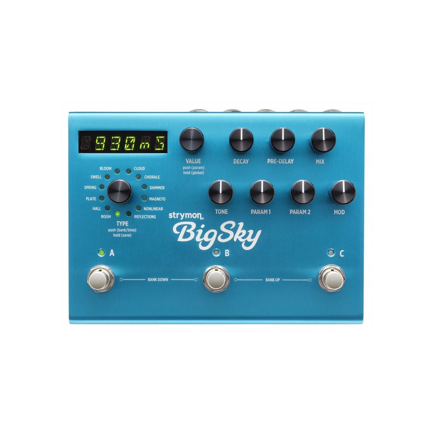 - LED display for preset info, reverb decay time, and extended parameter control