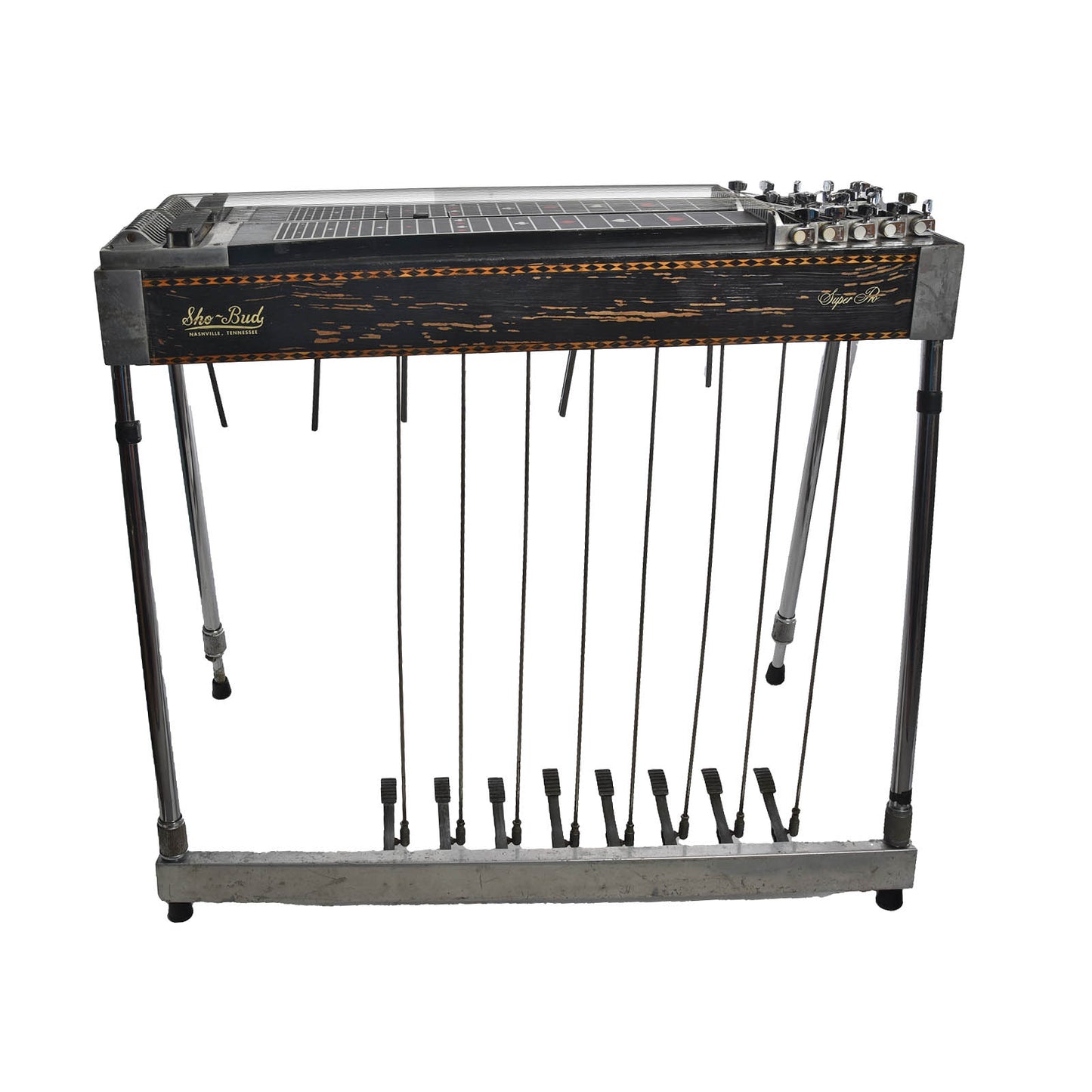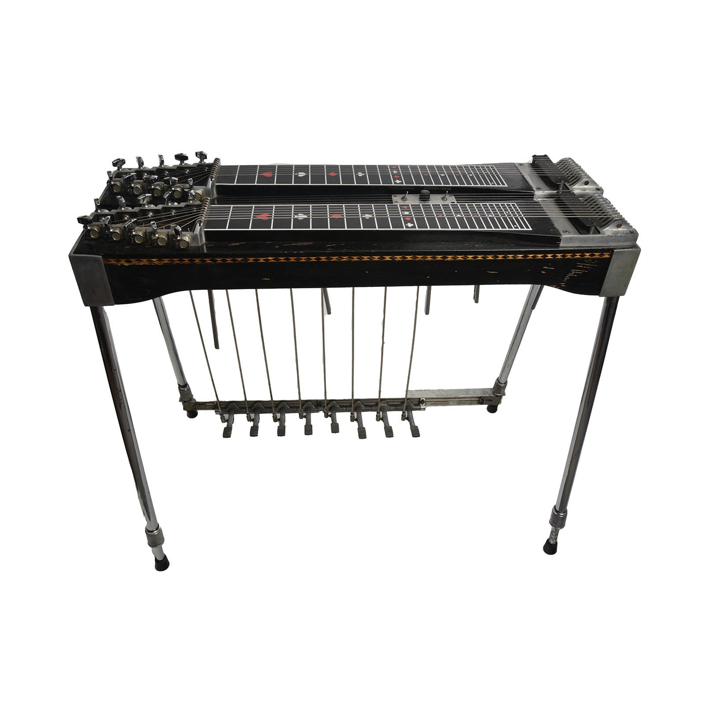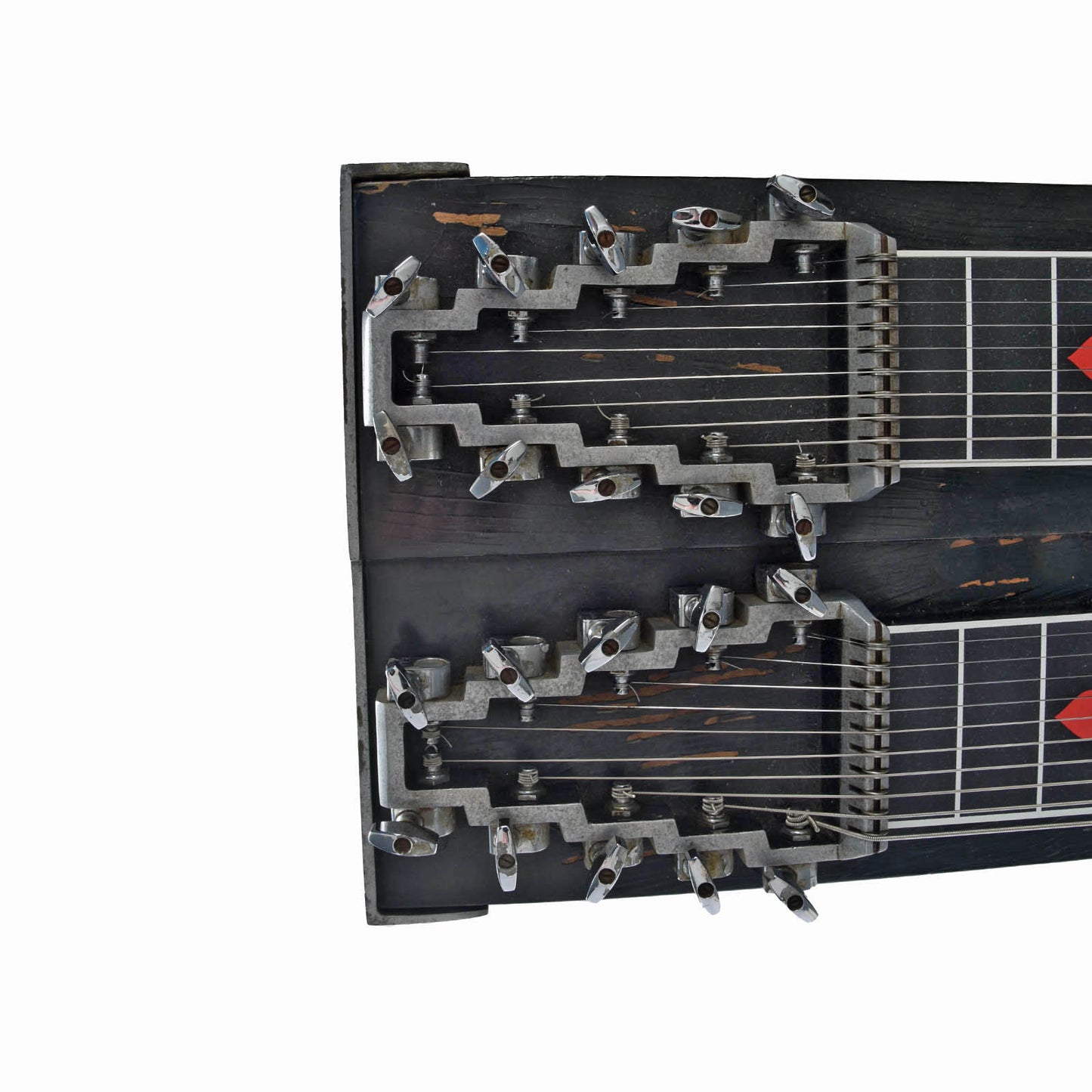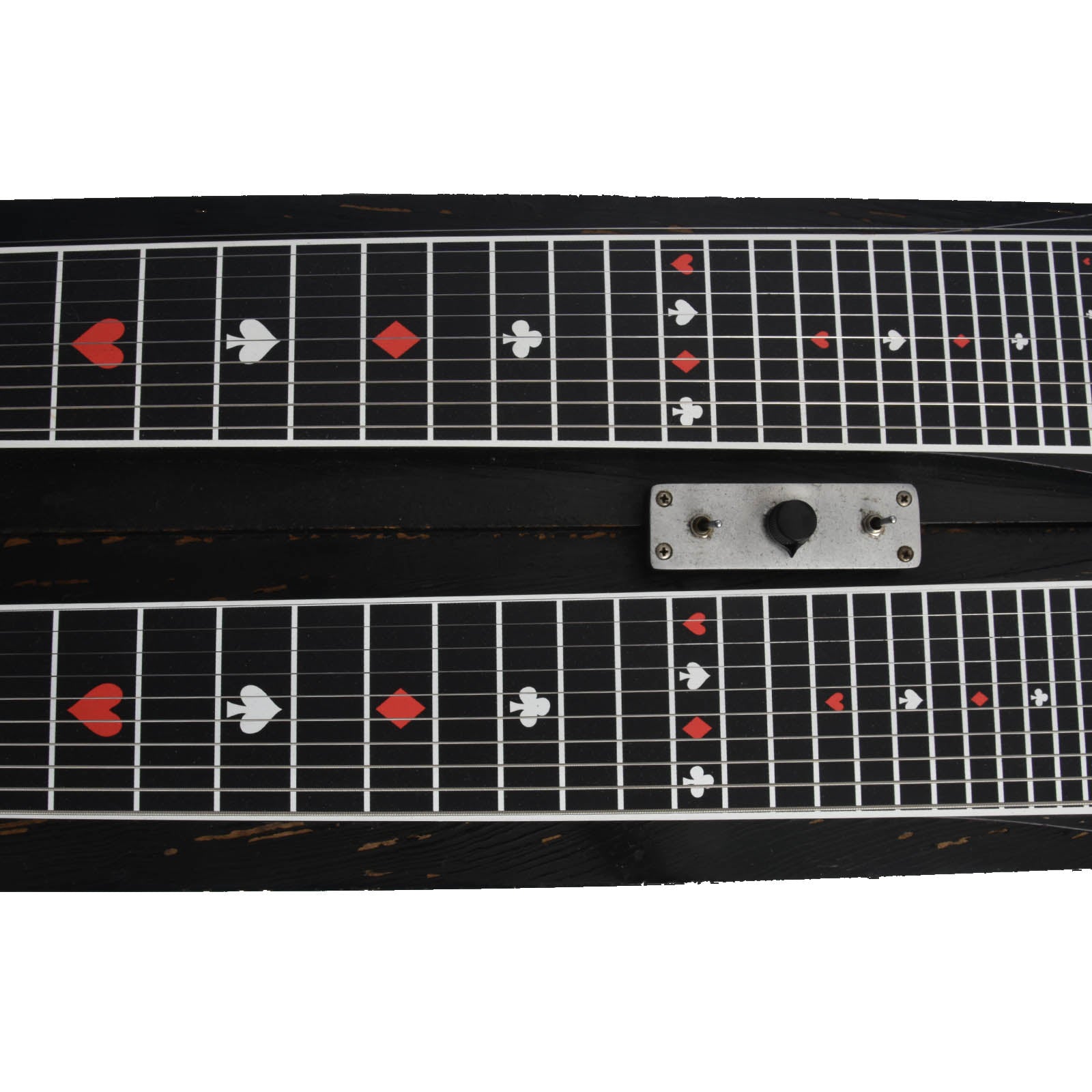 Introduced in 1978, this Super Pro was built by Sho-Bud, featuring a black finish on wood necks and cabinet, chrome finished aluminum endplates and legs, 2 single coil pickups, Sperzel tuners, E9 and C6 tunings, with 8 pedals and 6 knee levers. This guitar has a worn finish, but the pedals and levers work! Original hard shell case (rough). Made in USA.