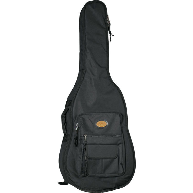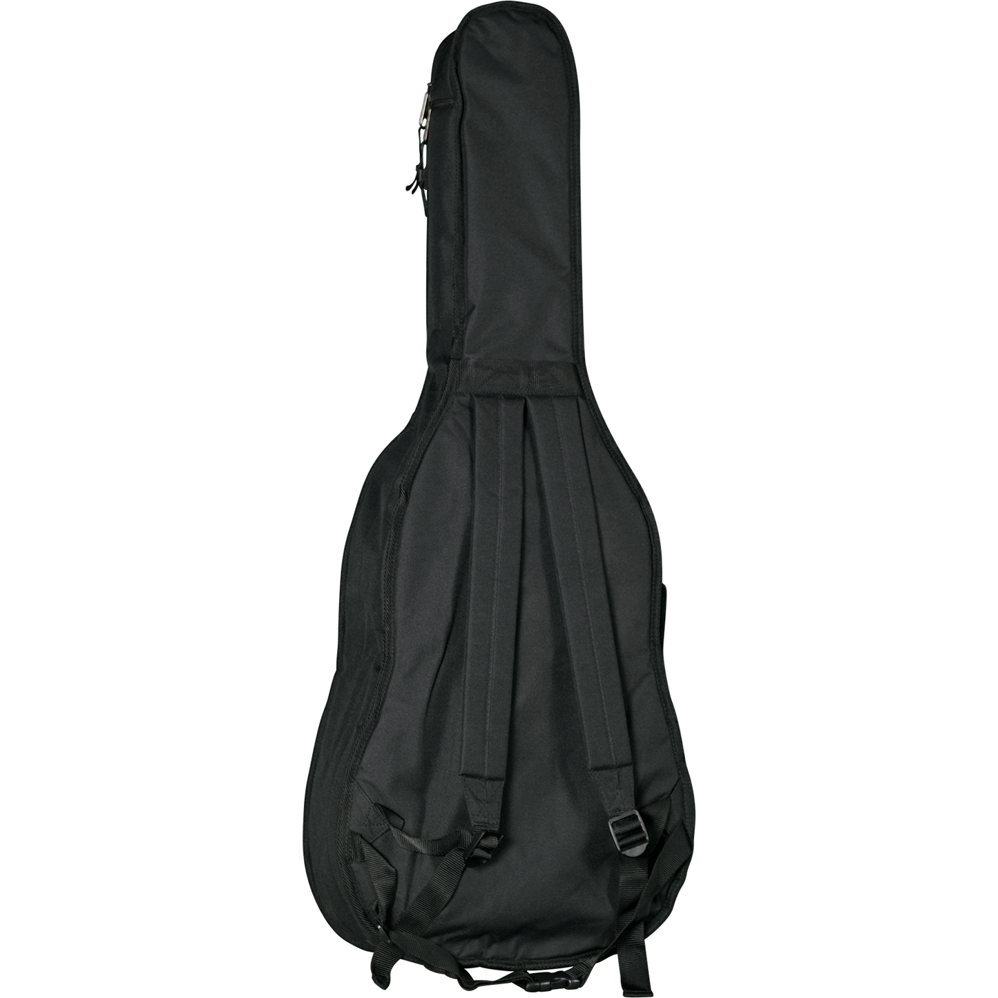 Designed for 00 / Dobro sized acoustic guitars, heavy-duty black nylon exterior with ~3/4" dense foam padding and red velvet interior. 2 adjustable backpack-style padded shoulder straps and webbed nylon handles. Multi-pocket cargo pocket on the outside. Full access heavy-duty black zipper. Reinforced seams. Imported by Saga.