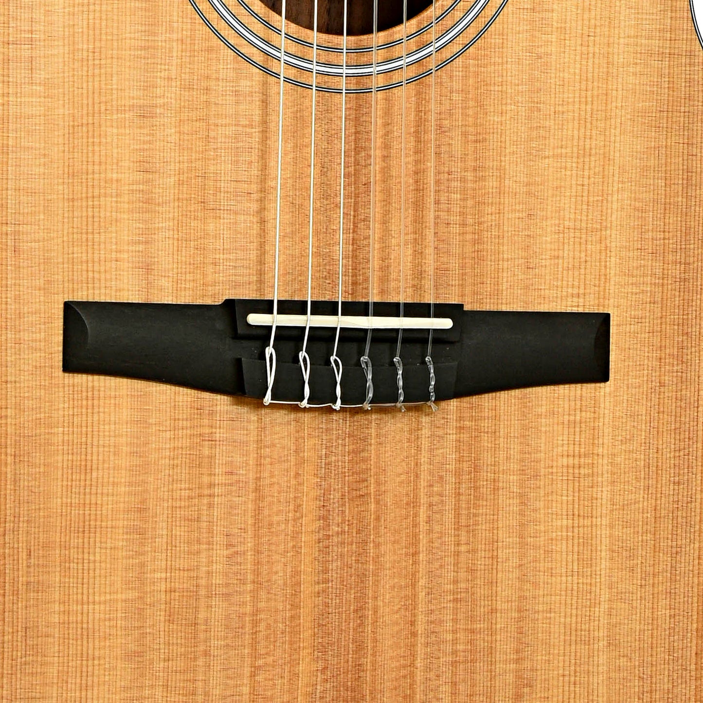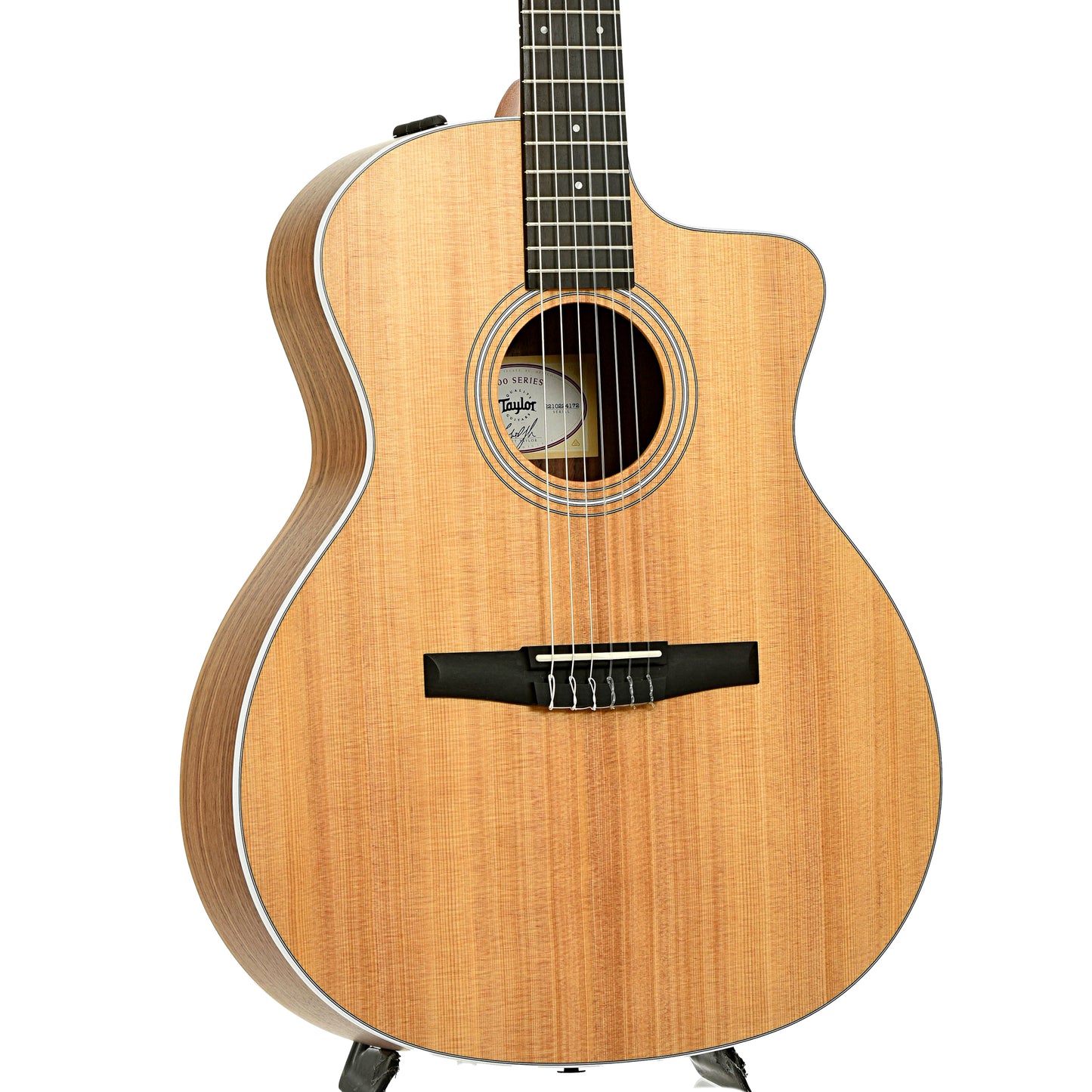 Sweet tones with this Taylor nylon string! Features include a body of spruce top and walnut back and sides, with a Venetian cutaway. It has an ebony fingerboard and bridge and slotted peghead. Equipped with ES2 pickup system, 3-on-a-plate tuners. Original padded gigbag. Import.
