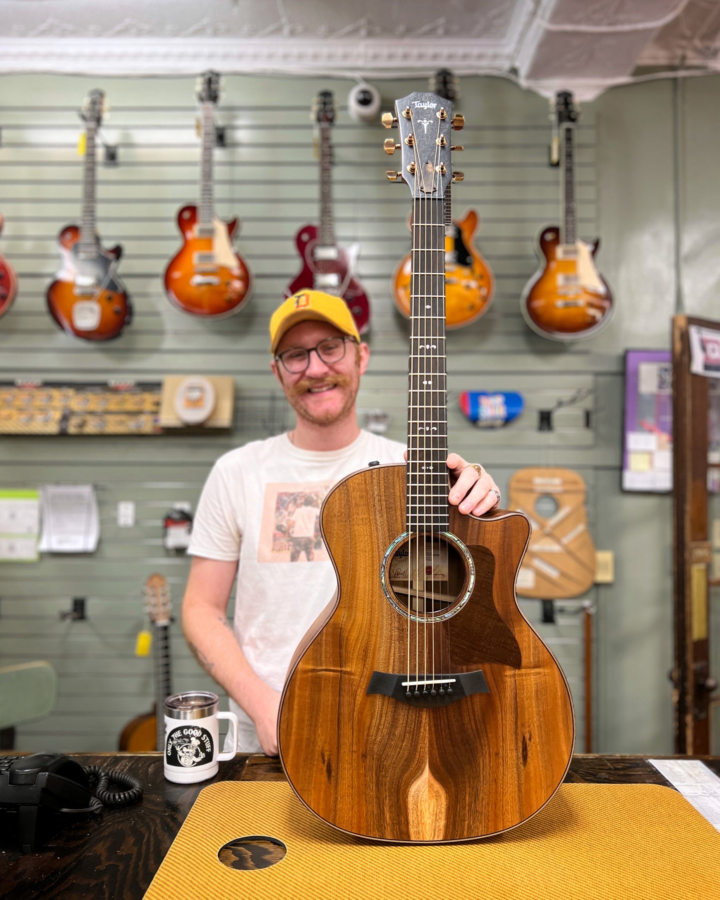 The 724ce Grand Auditorium boasts back, sides and top of solid Hawaiian koa selected for its visual beauty as well as its punchy, lively musical response. You’ll hear a bold attack with an energetic tone profile that yields crisp trebles, a rich midrange and a low end that grows in over time.