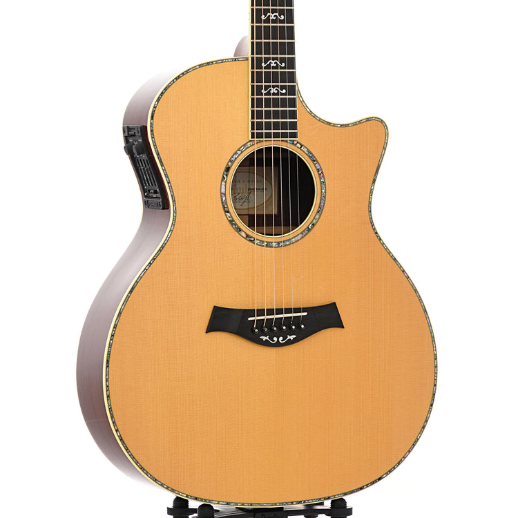 Acoustic-electric, double bound grand auditorium body, soft cutaway, spruce top, abalone rosette and top trim, rosewood back and sides, mahogany neck, bound ebony fretboard, EC