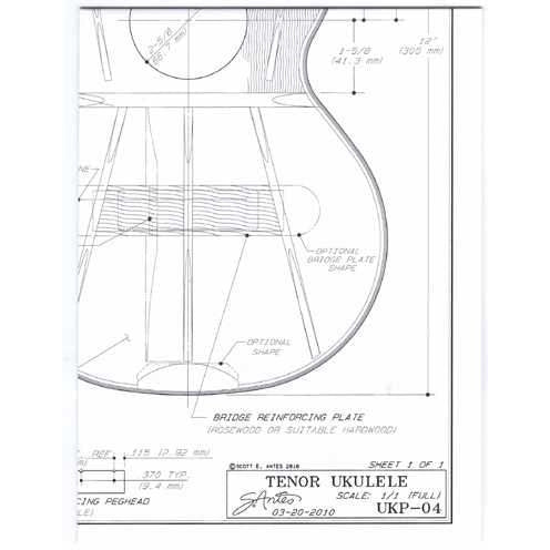 Full-scale blueprint. With construction options & notes. Options include: classical guitar-style bridge, "Spanish"-style neck attachment, guitar-style tuning machines, dovetail joint or tenon joint at neck.