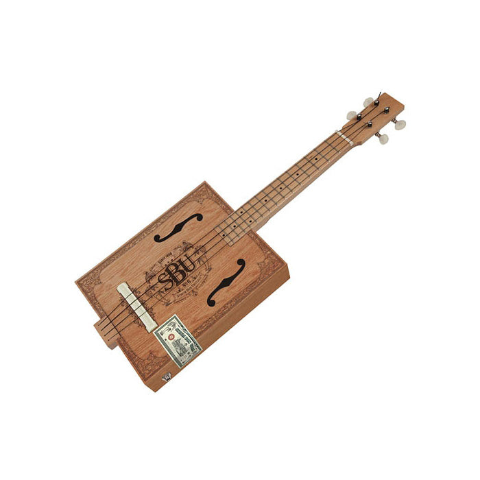 - Cigar box-style ukulele features a wooden neck and pressed cardboard body.