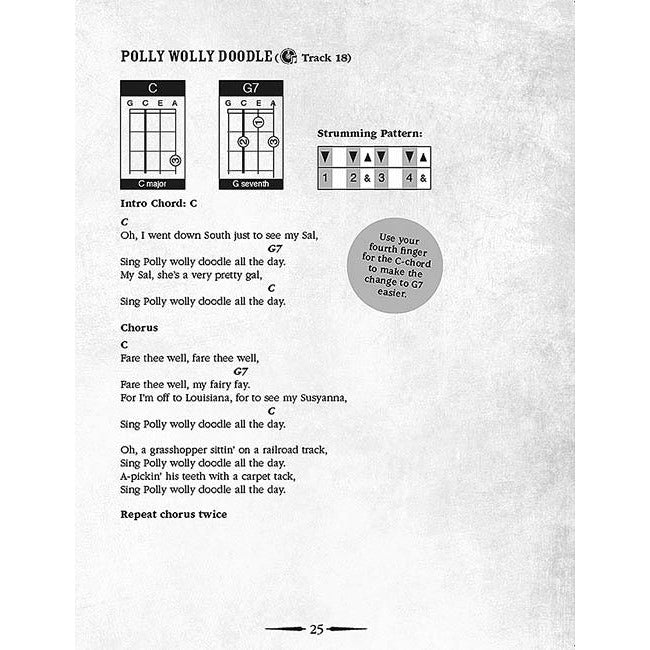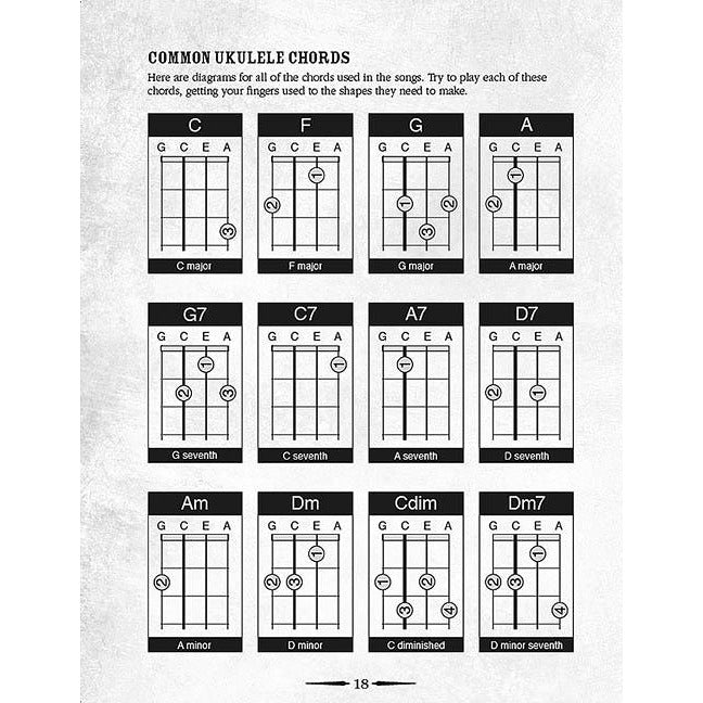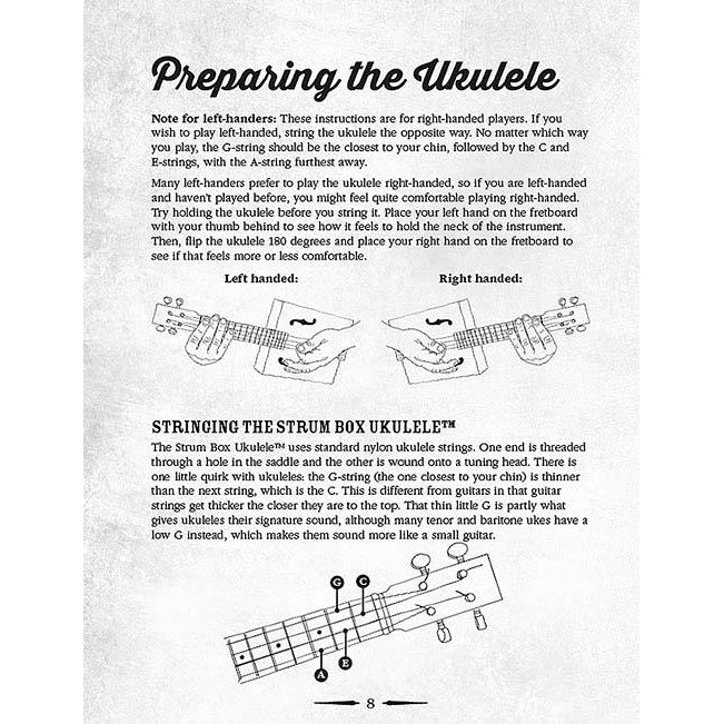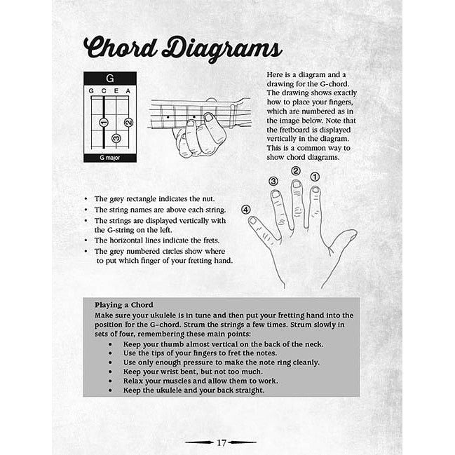 - 32-page book features illustrated diagrams and instructions on how to assemble and string your new uke, correct finger positioning and posture, commonly used chords, and strumming patterns