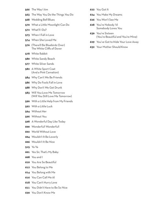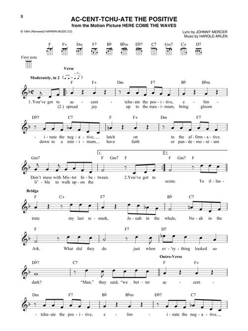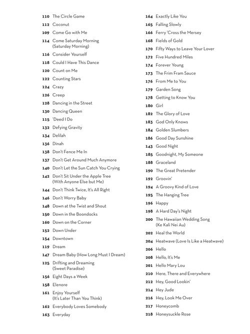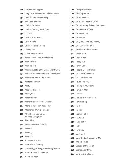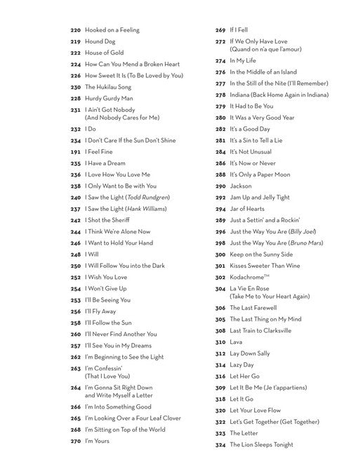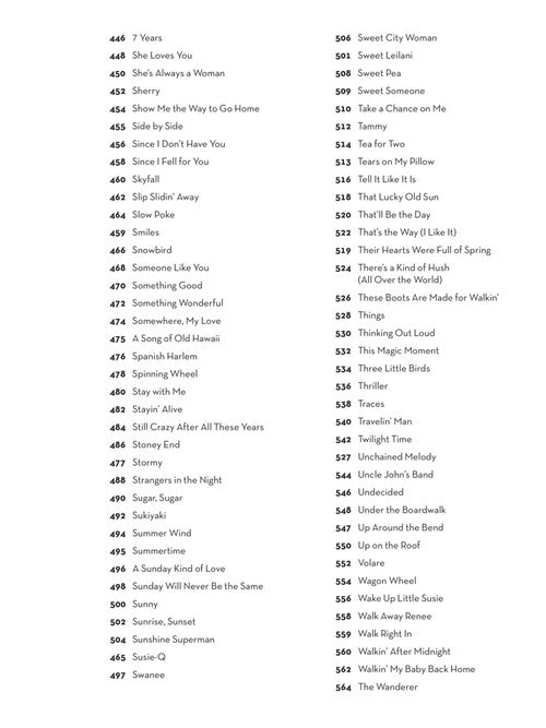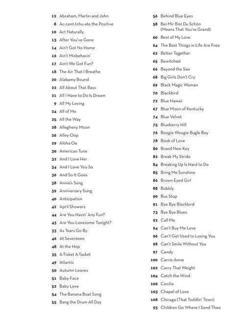 Uke enthusiasts will love this giant collection of over 400 songs for uke, presented with melody, lyrics & chord diagrams for each song in G-C-E-A tuning. Ain't Misbehavin', Annie's Song, Boogie Woogie Bugle Boy, Brown Eyed Girl, Counting Stars, Crazy, Dancing Queen, Downtown, Fields of Gold, Five Hundred Miles, God Only Knows, Happy, Hey Jude, I Feel Fine, I'm Yours, Let Her Go, The Lion Sleeps Tonight, Misty, No Particular Place to Go, Only You (And You Alone), Please Mr. Postman, Riptide, 7 Years, Summertime, Thinking Out Loud, Thriller, Under the Boardwalk, Wagon Wheel, When I Fall in Love, You Belong to Me, more. Comb-bound. 632 pp.