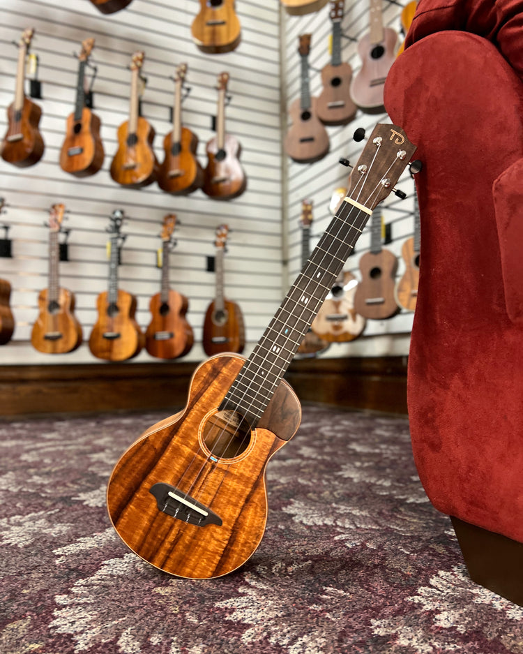 Handcrafted by respected luthier Shinji Toda from Shiga, Japan. This very impressive concert ukulele is all solid, highly flamed koa and many simple decorative features that give it an attractive contemporary appearance.