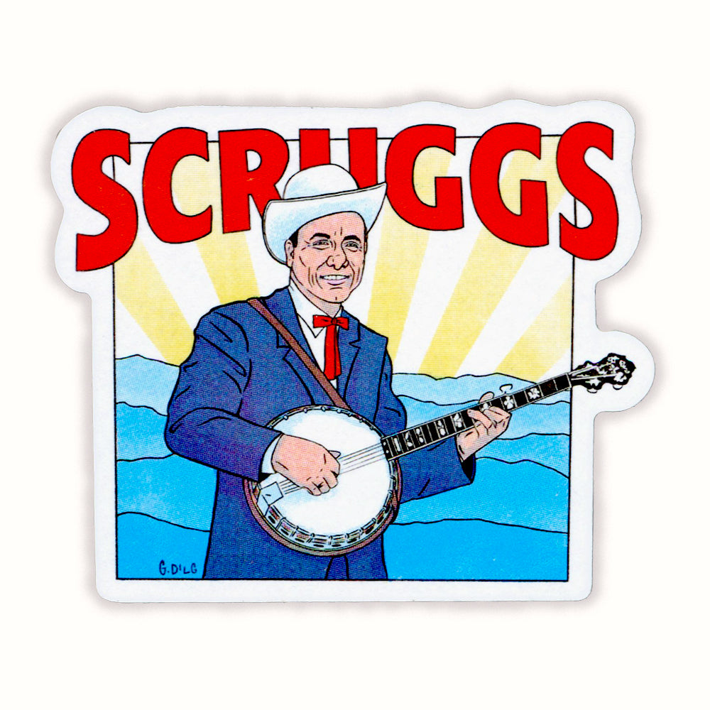 Show off your love for banjo virtuoso Earl Scruggs with this colorful sticker, created by Gina Dilg. A delightful addition to your sticker collection. Approx 4 in x 4 in. Collect them all!