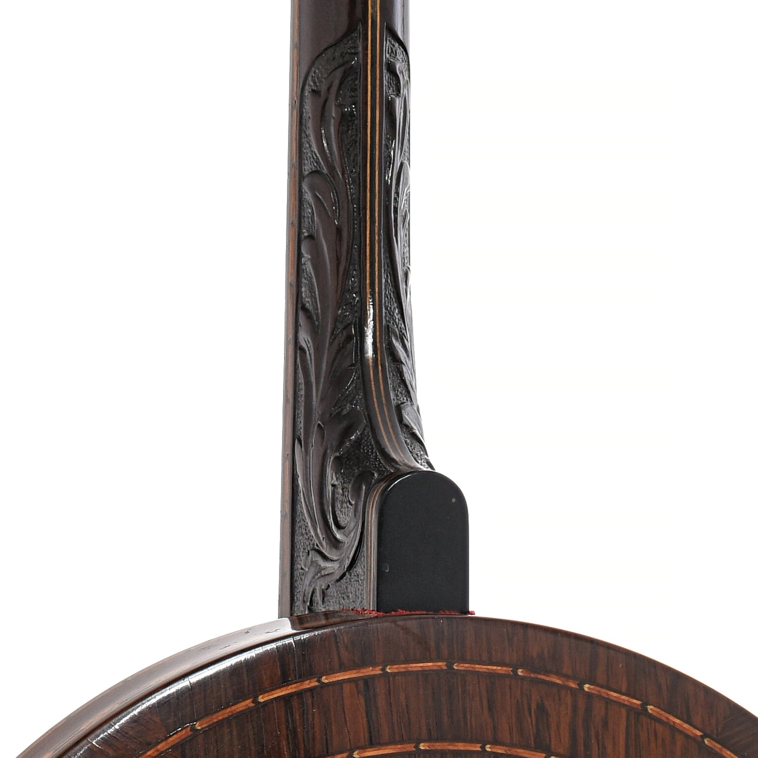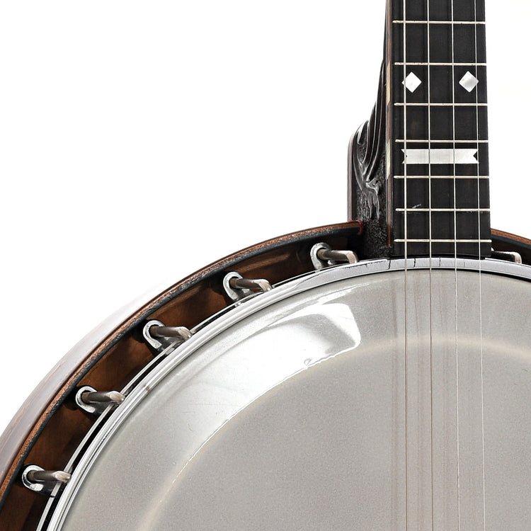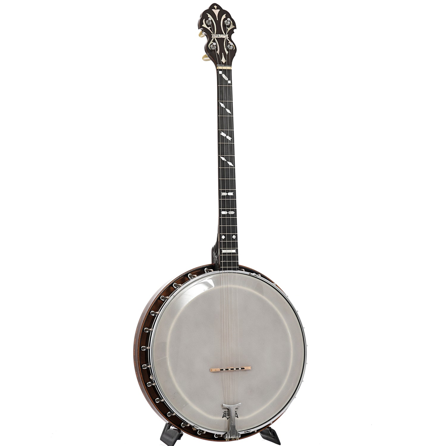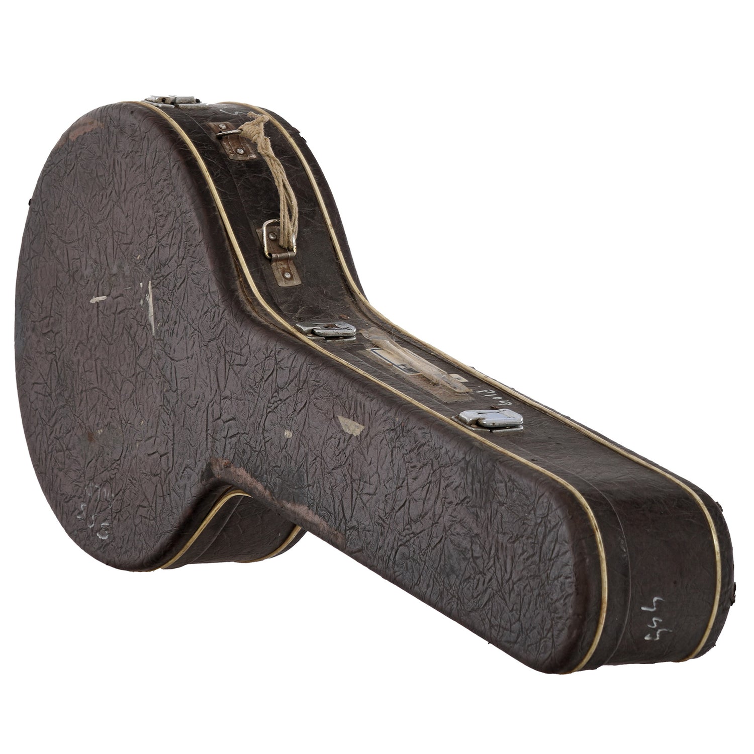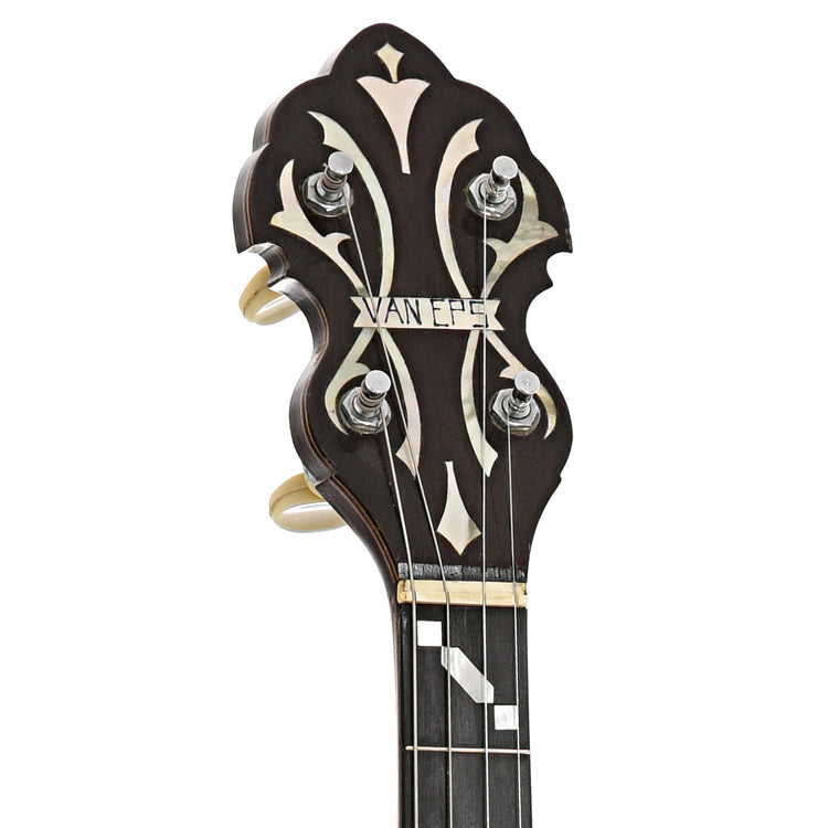 Fred Van Eps was a famous banjo player in his day. This is the fanciest Van Eps banjo we have seen. Brazilian rosewood neck and carved heel. This one also features a fancy resonator. The models that bear his name were designed by Fred and marketed by Lyon & Healy in Chicago. With rough semi-hardshell case.