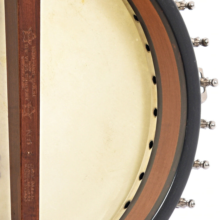 - Dowel stick stamped "49385", "Tubaphone" banner, "NO.3", "VEGA" in stars, "FAIRBANKS BANJO | MADE BY | THE VEGA COMPANY | BOSTON, MASS." "Patent numbers"