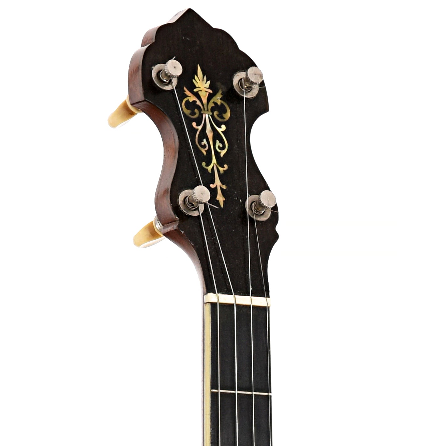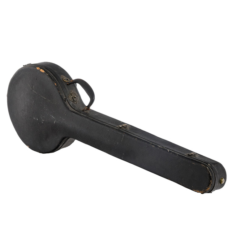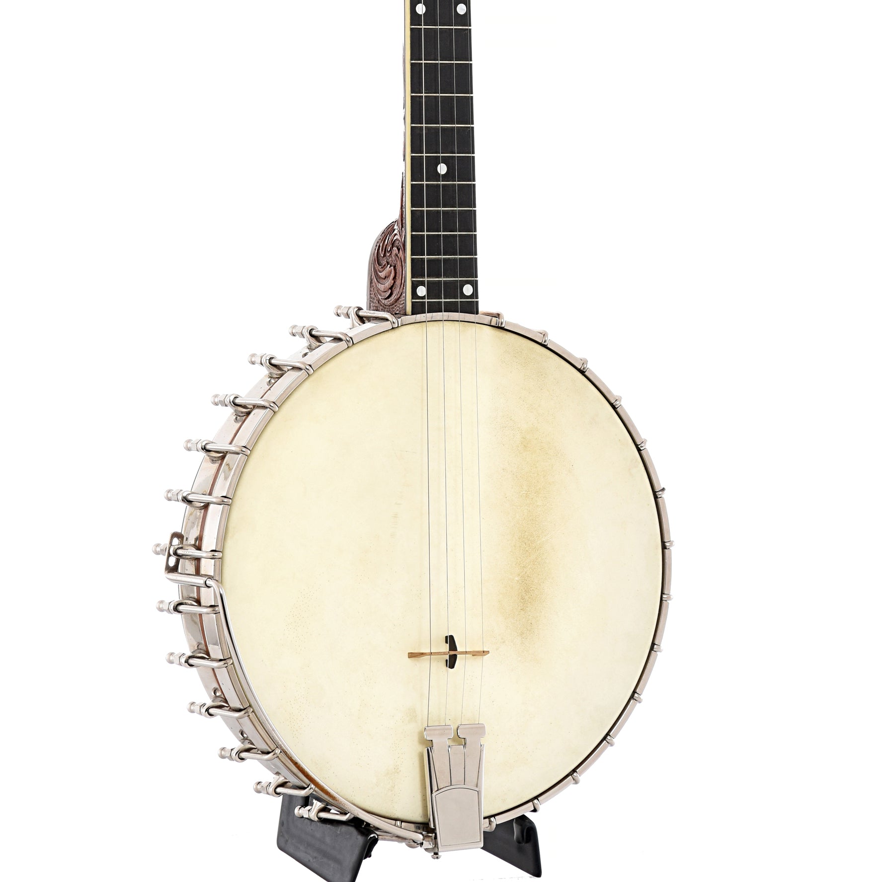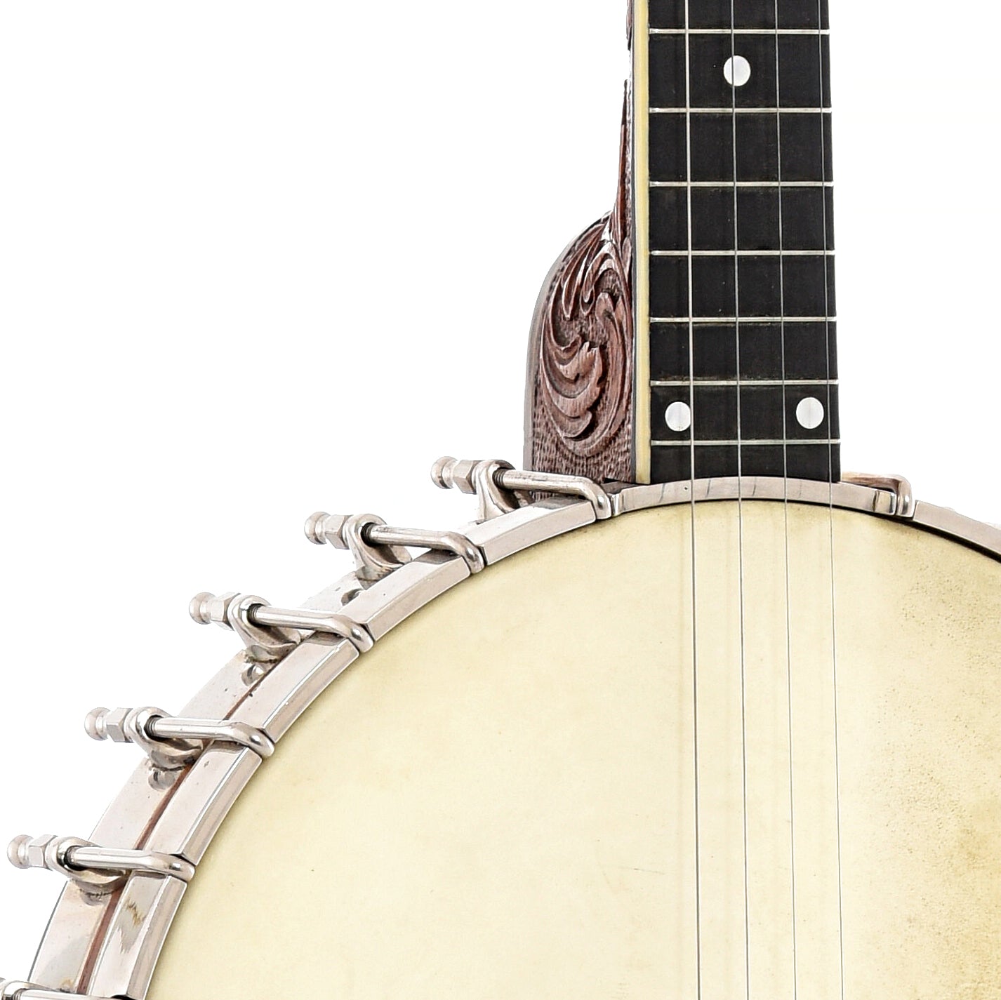 This lovely plectrum banjo from Boston sports a skin head and features a 2-piece mahogany neck with exquisite carved heel, Tubaphone tone ring, Presto tailpiece, and Grover Pat. Pend. tuners with ivoroid buttons. Work is needed to fully return it to its jazz-age glory
