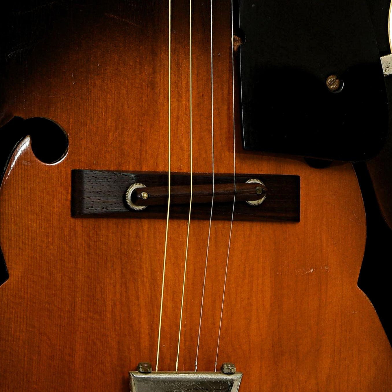 Attention, four string fans! This Ward archtop tenor was built in Kalamazoo, USA and features classic looks of sunburst finish on bound spruce top, dark-finished mahogany back, sides and 14-fret neck, Brazilian rosewood fingerboard and bridge, and friction tuners. Chipboard case.