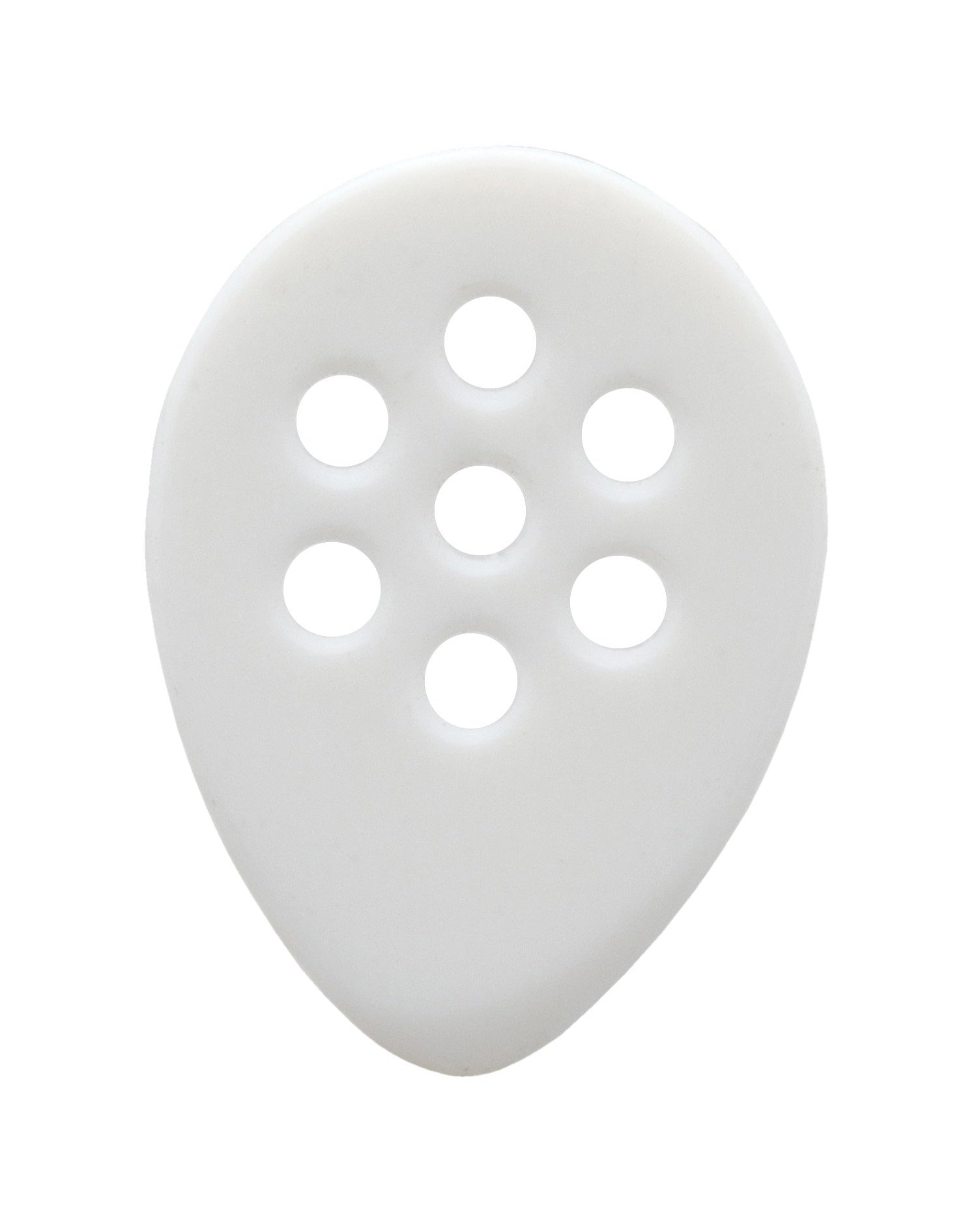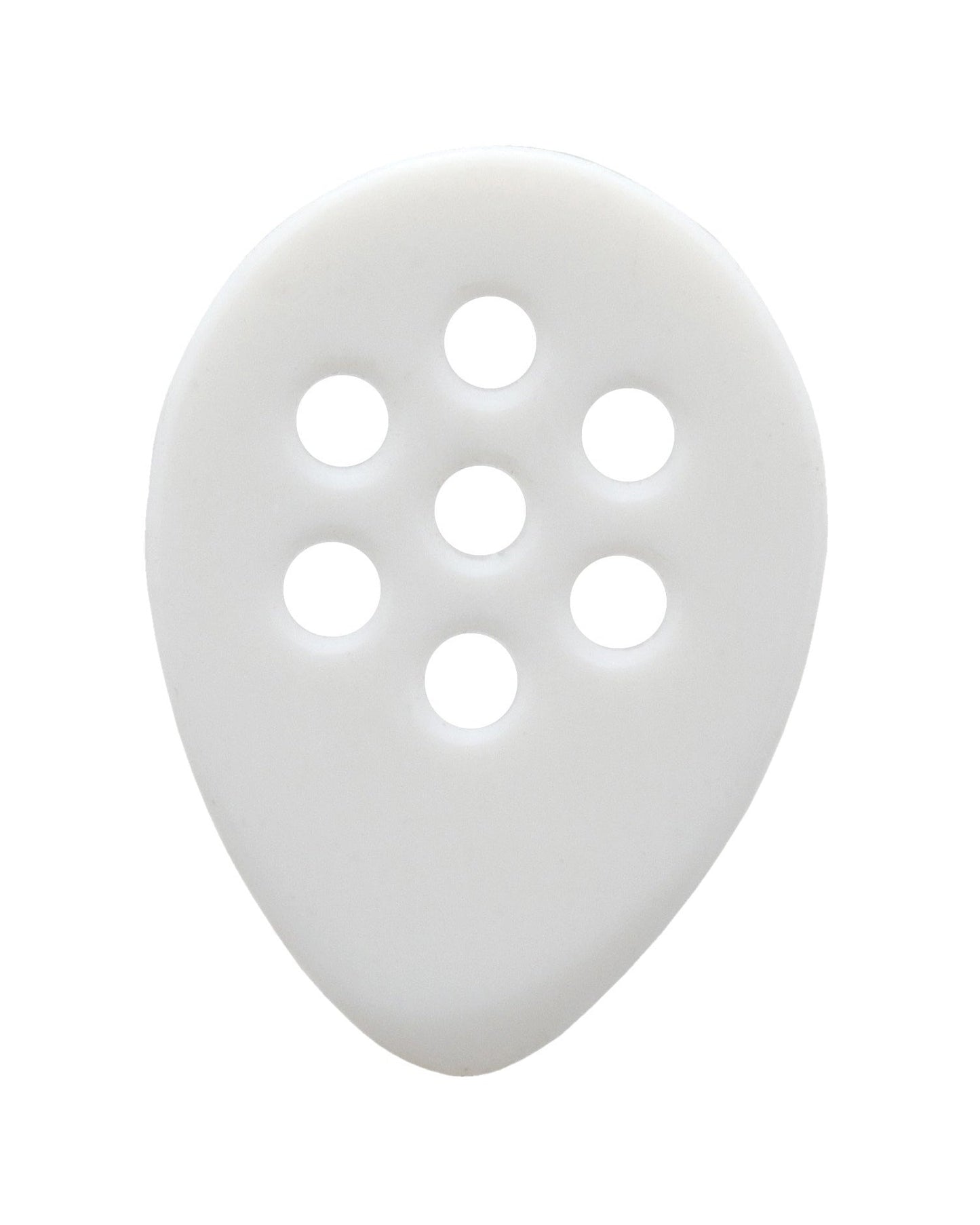 Set of four 2.20 mm teardrop shaped flatpicks with dual beveled-edge tip for right handed players. Has 7 holes in a circular pattern for grip. Designed with acoustic jazz and blues players in mind.