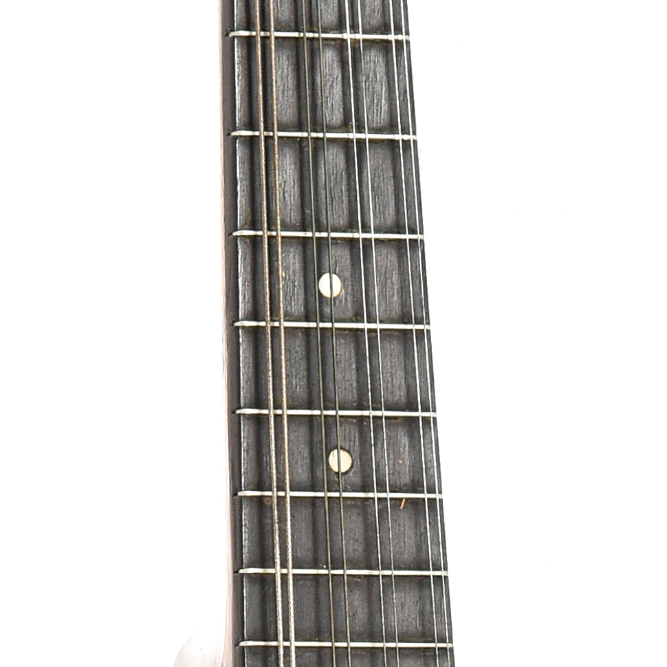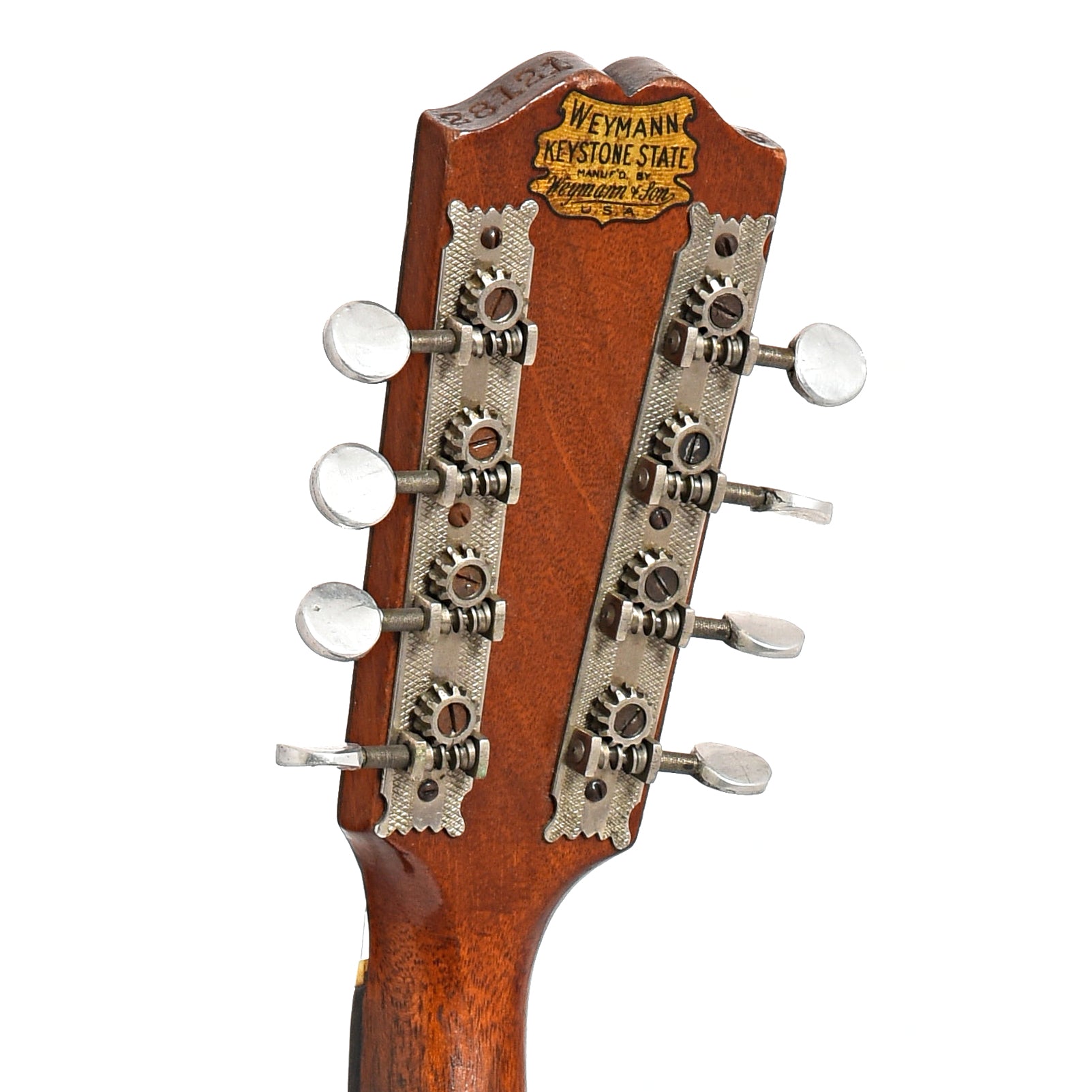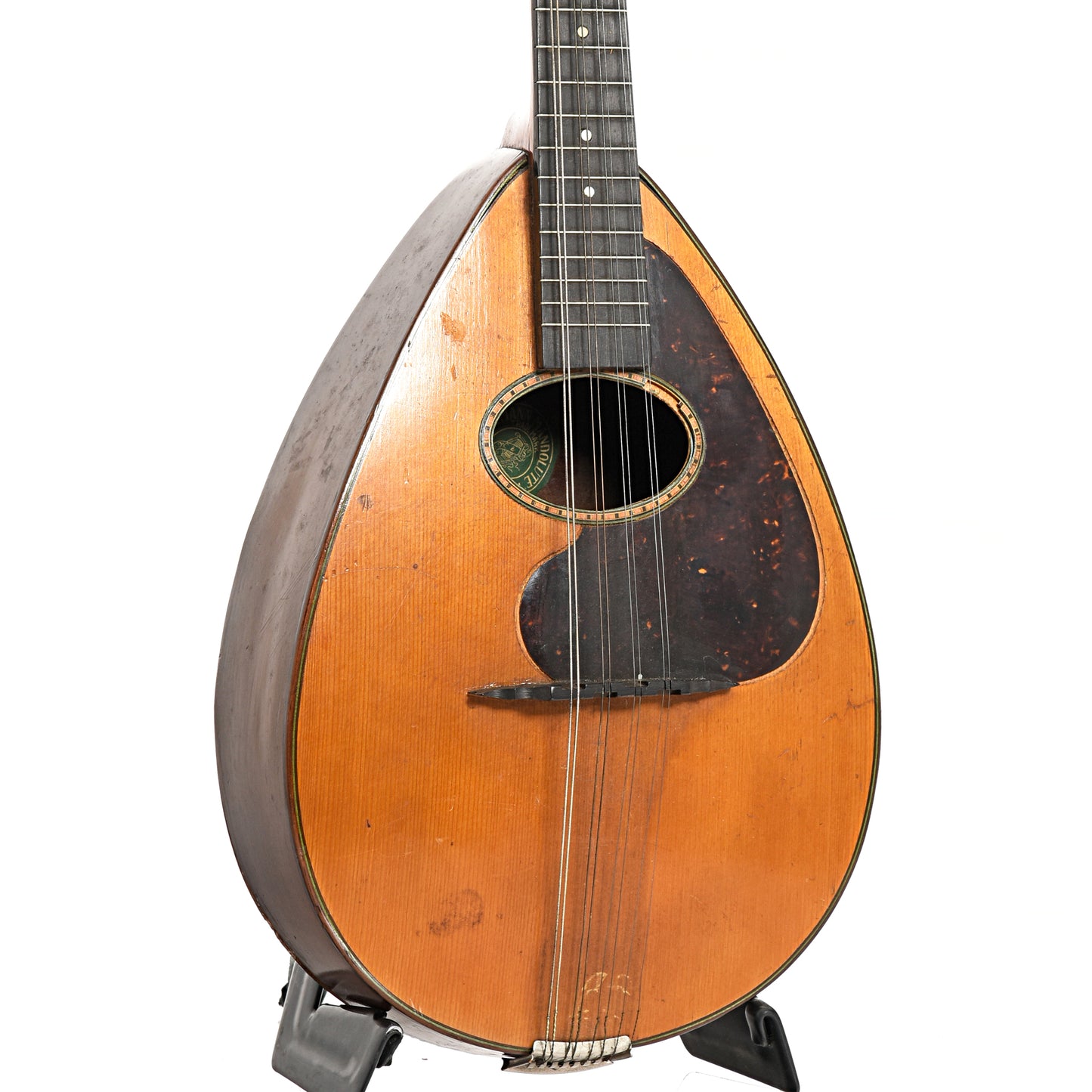 From early 20th century Philadelphia comes this elegant No. 15 Mandolute, a flat back mandolin built by Weymann. Features include a bent spruce top, inlaid tortoise plastic pickguard, oval soundhole with wood marquetry rosette, flamed maple sides and back. This 100-year-old mandolin needs much work (reset neck, refret, reglue loose back, loose braces, pickguard, replace kerfing, etc., etc. - sold AS-IS)