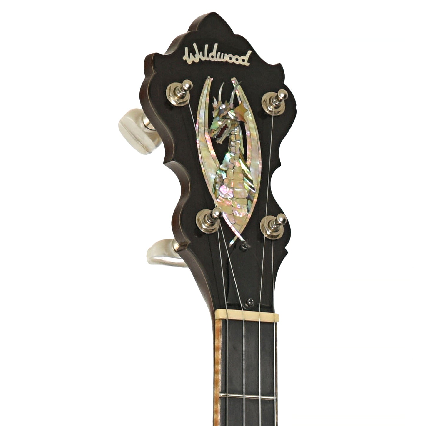 This fine Wildwood banjo was Mark Platin's personal banjo. Mark started the Wildwood banjo company in 1973 and built this custom banjo in 2004. It features a premium Brazilian rosewood neck and Honduran rosewood rim. Stunning pearl and abalone medieval dragon inlays. Handcrafted in the U.S.A. by Mark Platin. With Guardian hard shell case (green lining). EC. On consignment.