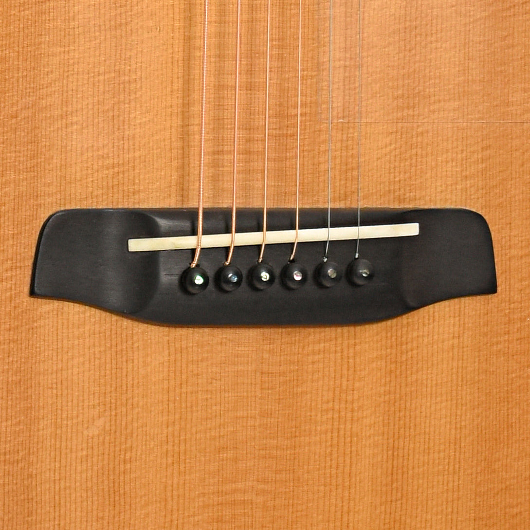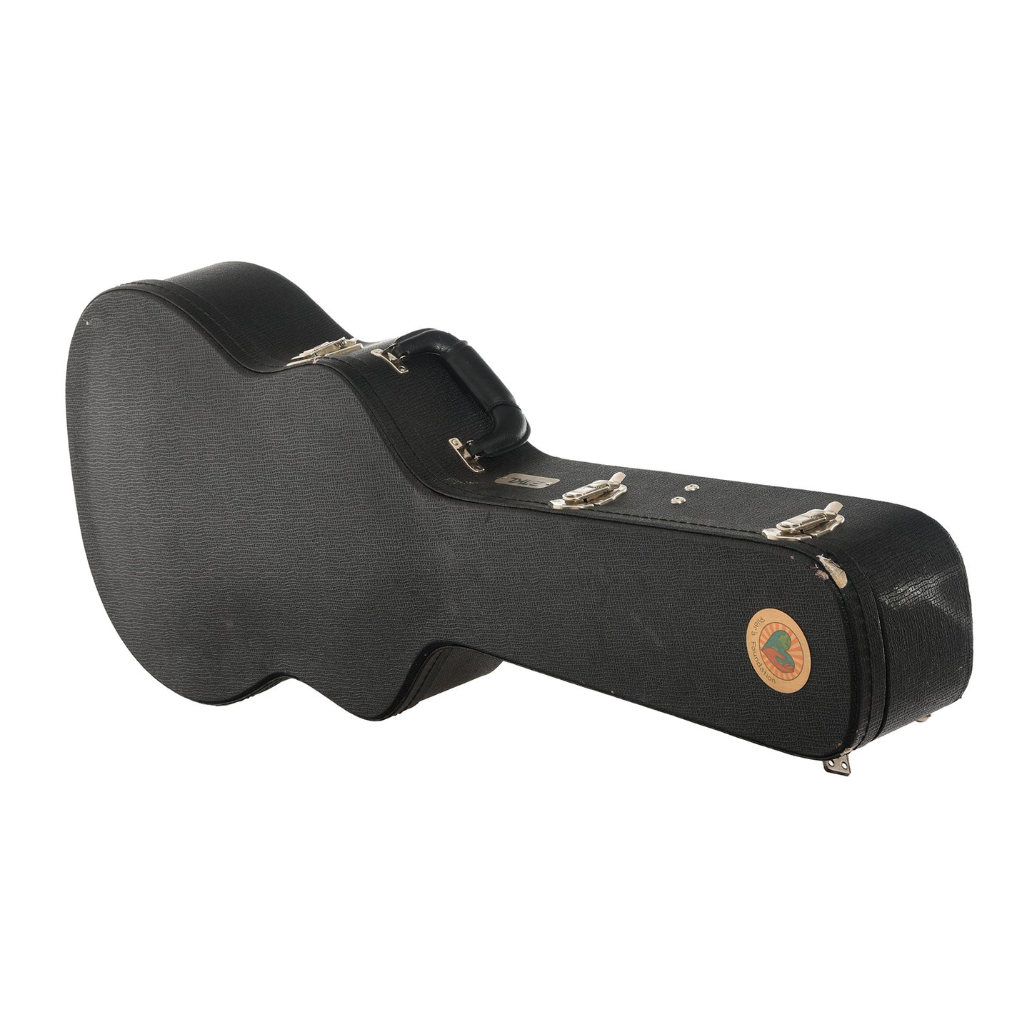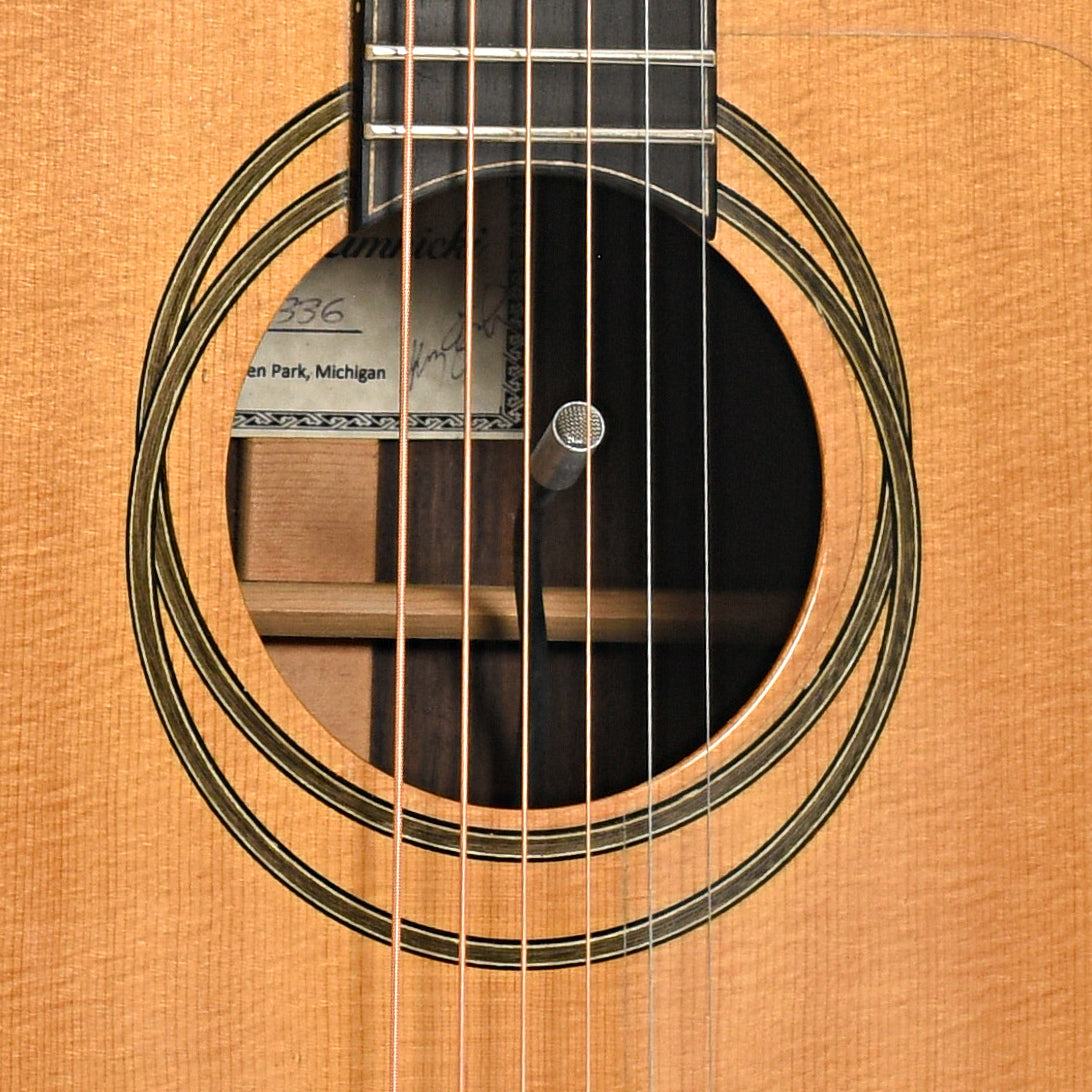 A very interesting steel-string guitar from the Detroit area, this Zimnicki sports a body of solid spruce top and rosewood back and sides, ebony fingerboard and bridge, with appointments of striped ebony binding, overlay and beveled cutaway. Great, big tones. Equipped with a K&K 3 pickup and internal mic system, with Gotoh 510 tuners. TKL hard shell case. Made in USA.